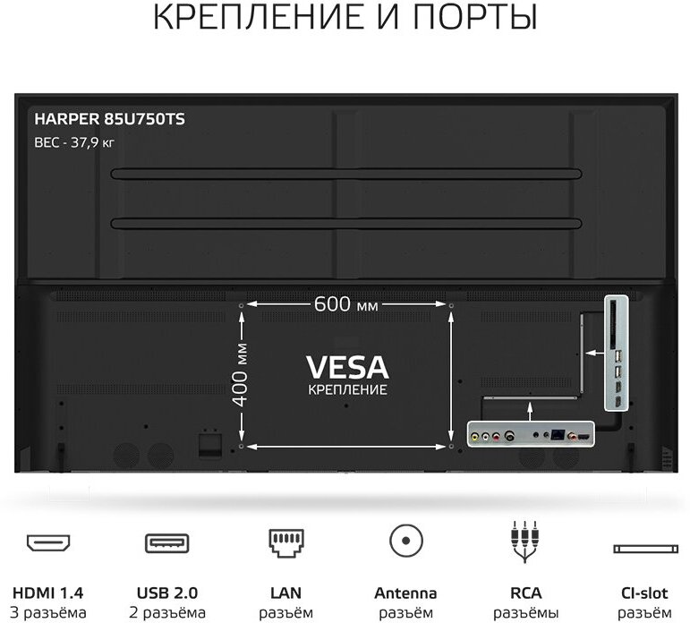 | Тип VESA (крепления на стену) | 600 x 400 |
