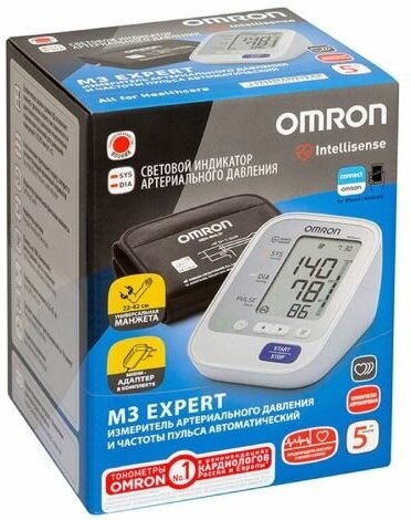 OMRON M3 Expert - это компактный функциональный тонометр, позволяющий быстро и точно измерить артериальное давление в домашних условиях. Отличительной особенностью этой модели является наличие индикатора движения. Эта функция позволяет избежать ошибки в измерении, которые возникают, если пользователь двигается во время процедуры. Датчик движения тонометра OMRON M3 Expert подает на дисплей сигнал, при появлении которого необходимо повторить измерение.