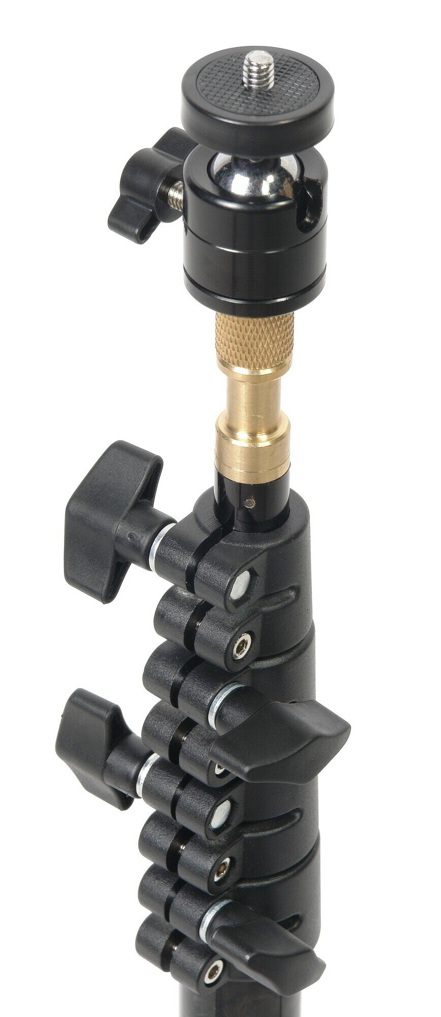 Godox 210F - алюминиевая стойка-тренога с 5-секционной телескопической центральной колонной, на конце которой закреплен несъемный латунный шпигот диаметром 5/8” с резьбой 1/4” и шаровой головкой. Стойка предназначена для установки цифровых камер для съемки в фото- или видеостудии, а также на выезде. Максимальная рабочая высота 213 см. Стойка выдерживает осевую (вертикальную) нагрузку до 2 кг. Секции центральной колонны диаметром 29, 26, 19, 16 и 13 мм изготавливаются из легкого и прочного алюминиевого сплава. Перед покраской трубы проходят калибровку - для особенной плавности хода секций, с небольшим, равномерным и дозированным усилием скольжения на всей рабочей длине. Секции фиксируются металлическими винтовыми зажимами с крупными ручками из прочного ABS пластика. Реверсивные ноги для компактного хранения выполнены из алюминиевого профиля сечением 16х7 мм, что значительно облегчило конструкцию - длина стойки в сложенном виде всего 51 см, а вес 1.2 кг. Стойка Godox 210F снабжена шаровой головкой с металлическими винтом на конце (с посадочной резьбой 1/4”), на который устанавливаются, например, цифровые камеры. Установленное оборудование может вращаться вокруг своей оси на 360 и наклоняться вперед в пределах 90°. В комплект также входит гайка-переходник с резьбы 1/4” на 3/8”.