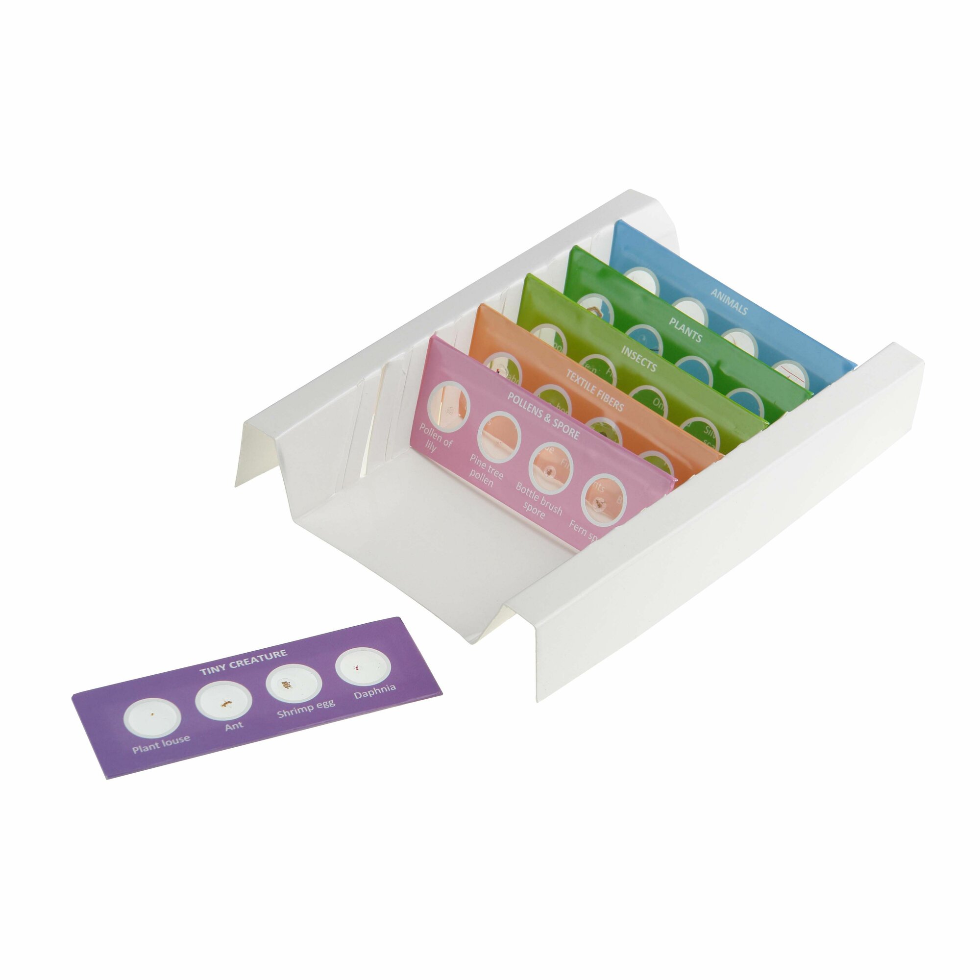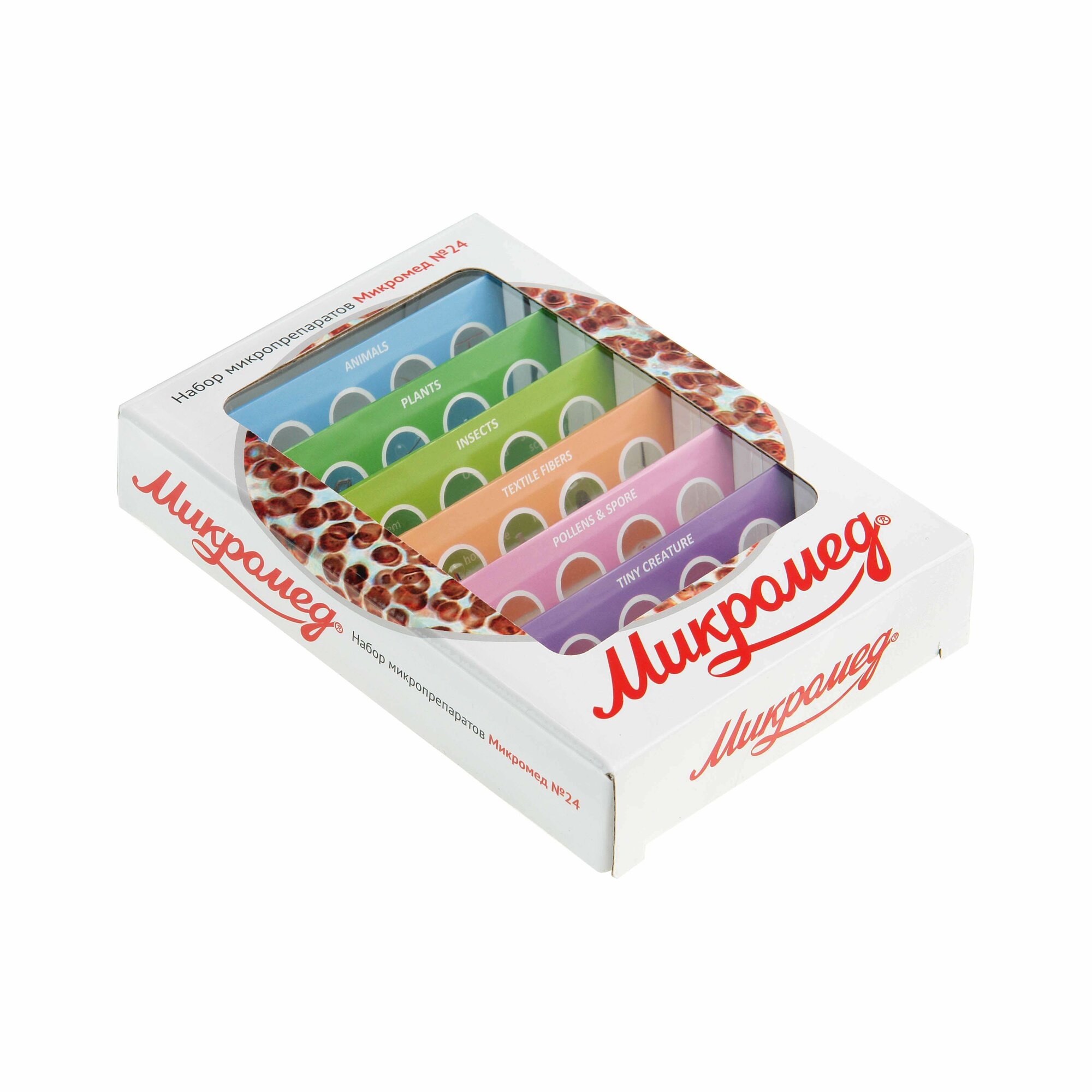 Набор готовых препаратов для проведения исследований на учебном биологическом микроскопе проходящего света. Для дошкольного и младшего школьного возраста. Набор состоит из 6 стекол. На каждом стекле по 4 микропрепарата. Микропрепараты безопасны для ребенка - стекла запаяны в пленку. Микропрепараты разделены на темы: Шерсть животных (мыши, зайца, собаки и овцы). Срезы частей растении (стебель арахиса, лист фикуса, кожица лука и чешуйки шефердии серебристой). Части насекомых (брюшко пчелы, лапка пчелы, крыло саранчи, ножка мухи). Материалы (цветные нити, бумага, отпечаток пальца, шёлк). Пыльца и споры растений (пыльца лилии, пыльца сосны, пыльца полевого хвоща, споры папоротника). Насекомые и ракообразные (тля, муравей, яйца креветки, дафния).