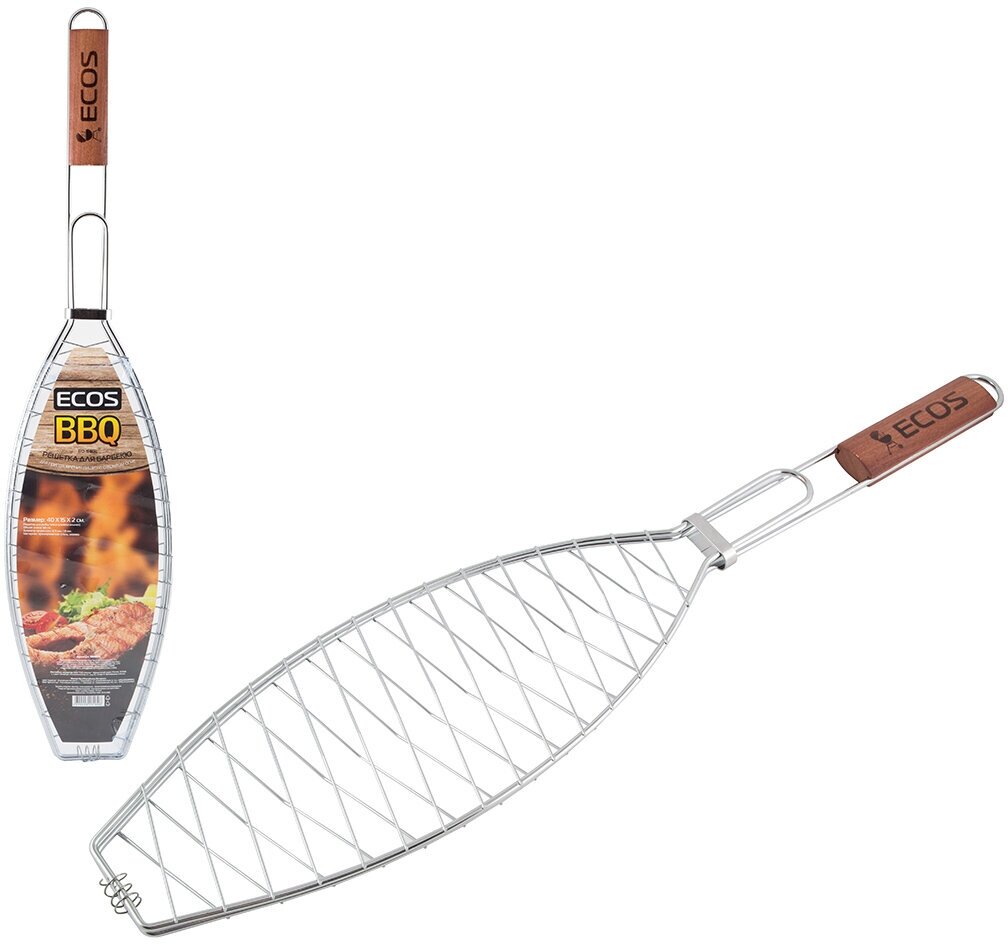 Решетка для барбекю и гриля ECOS рыбная изготовлена из прочной хромированной стали. Благодаря своей форме она оптимально подходит для приготовления рыбы на углях. Овальная вытянутая решетка совместима с мангалами всех размеров. Размер рабочей части у этой модели составляет 27х9см, благодаря чему в ней можно пожарить даже крупную рыбу.