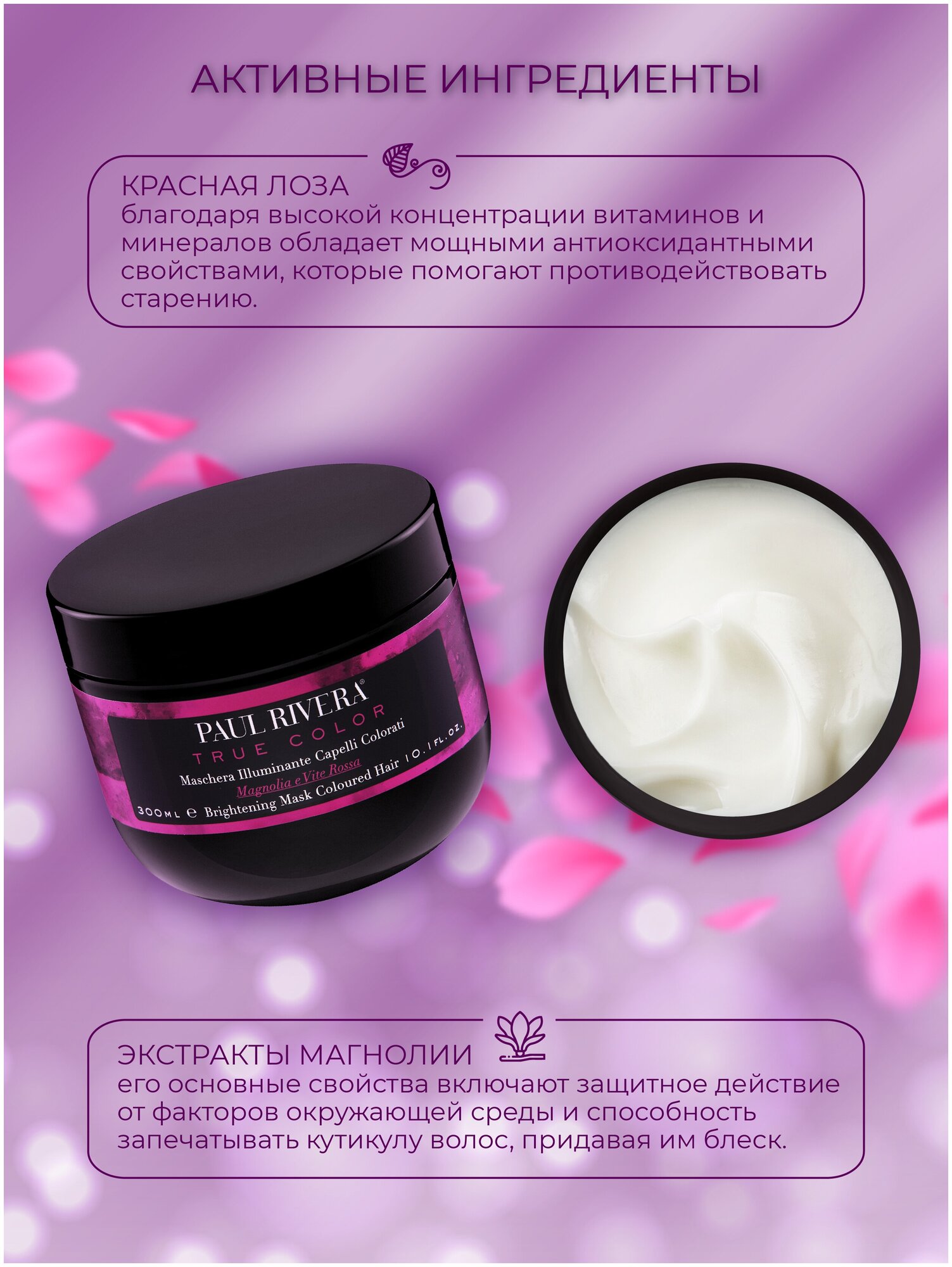 Маска для сияния окрашенных волос обладает стойким защитным действием и восстанавливает структуру волос. При использовании в комплексе с шампунем для сияния волос она защищает цвет от неблагоприятного воздействия, сохраняя живой блеск волос. Богатая формула с эффектом кондиционирования придает волосам сияние: экстракты магнолии и красных листьев винограда увлажняют и питают волосы, а также поддерживают блеск волос с поврежденной структурой, защищая красящие пигменты и предупреждая потускнение цвета.