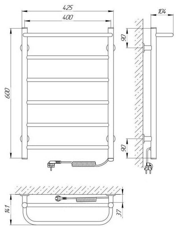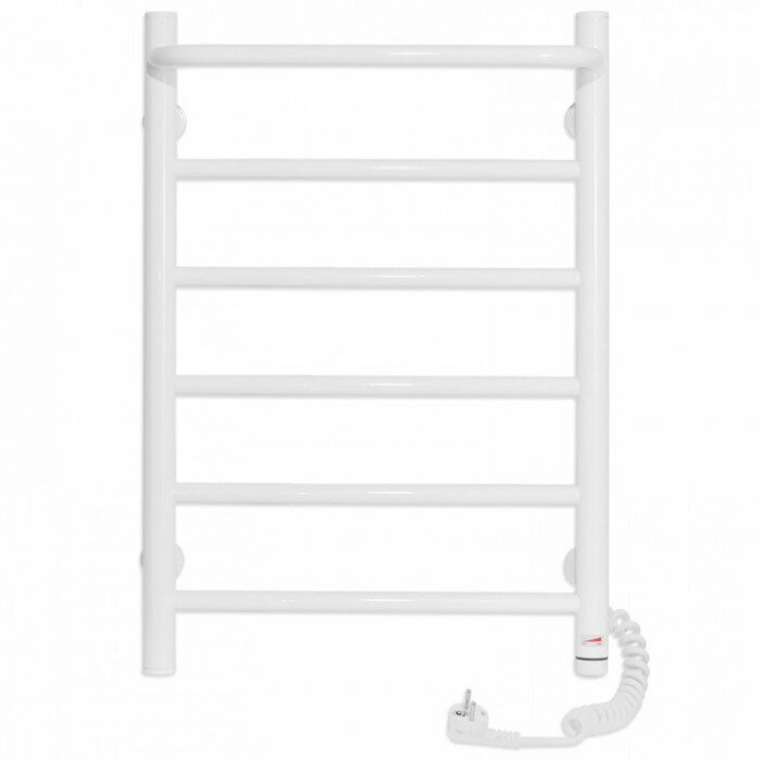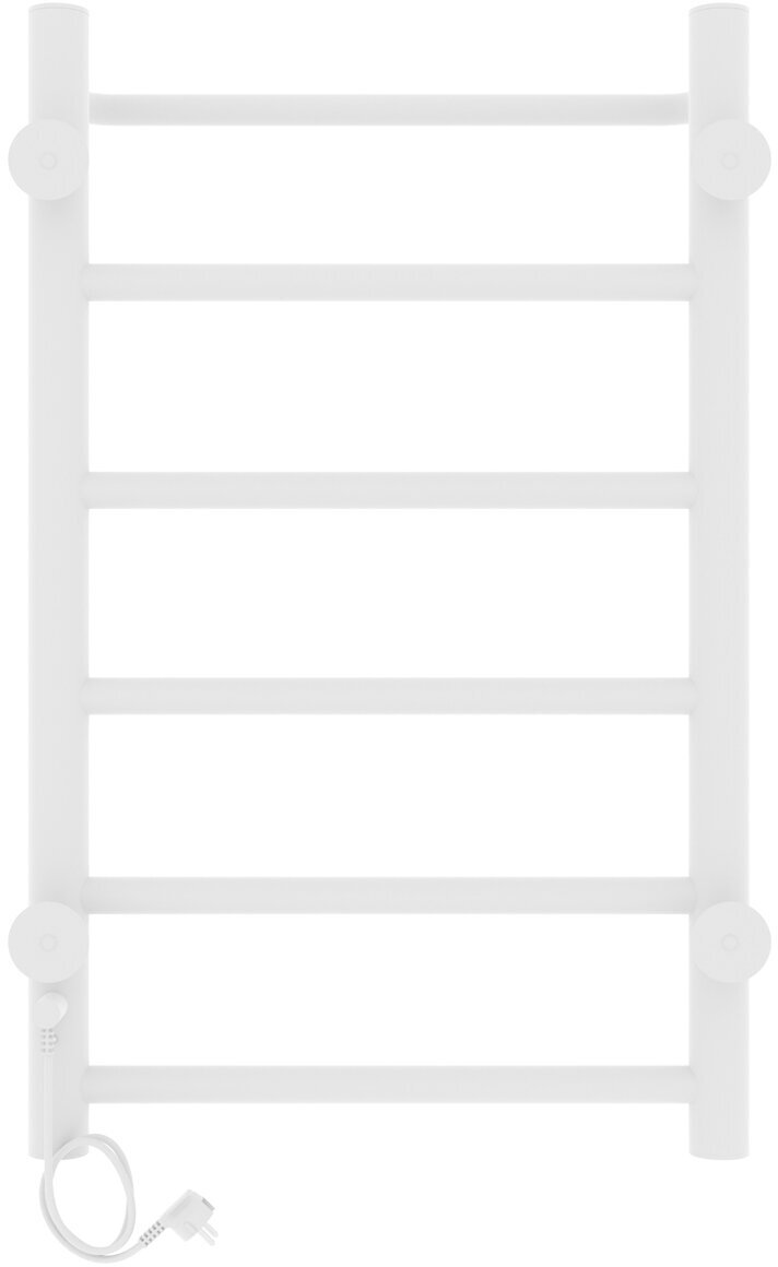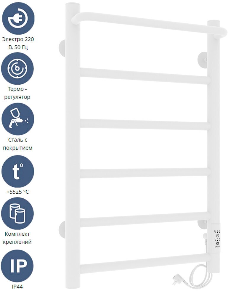 Полотенцесушитель электрический Laris Прайм ЧК П6 400х600 Э с терморегулятором имеет современный дизайн и прочную конструкцию. Материал сталь черная. Покрытие: краска порошковая белая RAL 9016. Напряжение питания 220 В. Частота тока 50 Гц. Температура поверхности изделия плюс минус 5 к 50. Размещение терморегулятора снизу на стойке (доступно скрытое подключение). Проверка на пробой изоляции производится напряжением в 1500В. Для скрытого подключения вам понадобиться «Модуль скрытого подключения». Модуль скрытого подключения не является частью комплектации полотенцесушителя **(приобретается отдельно)**. Размещение шнура справа. Диаметр и толщина: стойка Ø25, толщина 1,5мм; перемычка Ø16, толщина 1,5 мм. Отступ от стены - 37 мм. Расстояние между центрами крепления 400 мм. Теплоноситель - греющий кабель. Площадь обогреваемого помещения 3 м2. Время нагрева до 10 минут. Оснащение: нагревательный кабель, световой индикатор. Цвет белый. В комплектацию входит: полотенцесушитель, крепление на стену (шуруп оцинкованный с дюбелем, пятак, втулка, штифт, стойка) - 4 штуки, ключ шестигранный, паспорт. Полотенцесушитель упакован в чехол полиэтиленовый.
