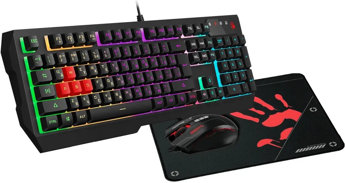 Клавиатура+мышь A4Tech Bloody B1700 – стильный и функциональный комплект манипуляторов, созданный для поклонников компьютерных игр. В наборе поставляются клавиатура с полноразмерной раскладкой клавиш и многоцветной подсветкой символов, мышь на базе оптического светодиодного сенсора с 8 программируемыми кнопками и широким диапазоном настройки чувствительности от 1000 до 6000 dpi, а также коврик. Мембранный механизм клавиш гарантирует высокую точность и отзывчивость в играх. Подключение мыши и клавиатуры A4Tech Bloody B1700 к ПК выполняется с помощью проводного интерфейса USB.