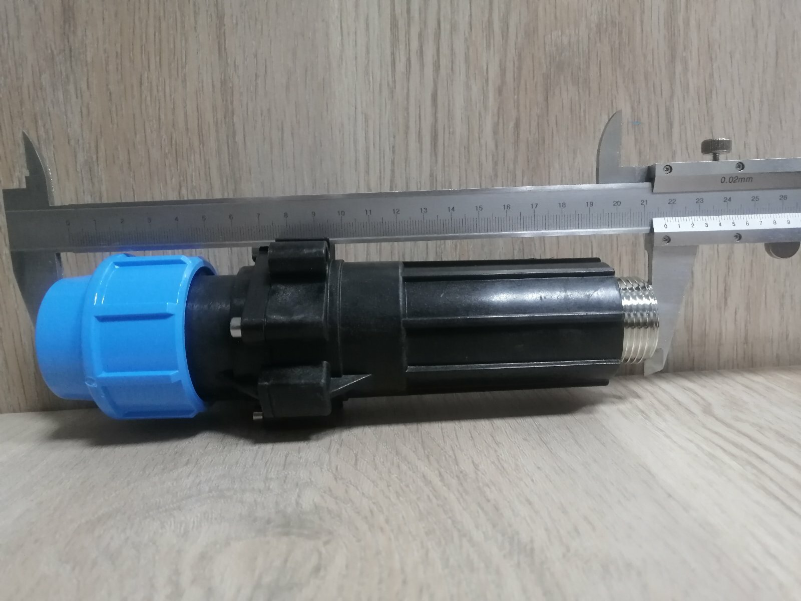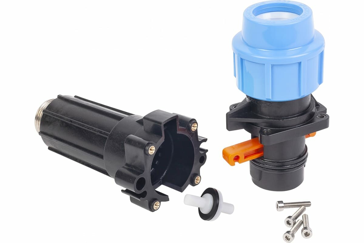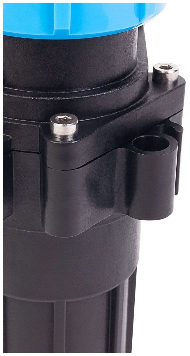 Монтаж осуществляется на скважинный адаптер, либо в разрез напорной трубы (резьбовым способом в верхней части и цанговым соединением в нижней). Винты, соединяющие верхнюю и нижнюю части корпуса - из нержавеющей стали.