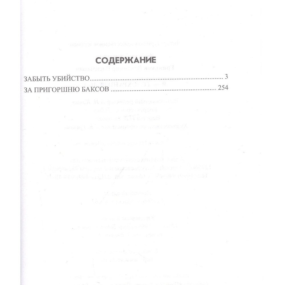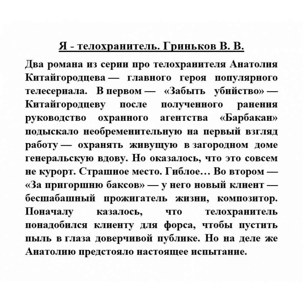 Два романа из серии про телохранителя Анатолия Китайгородцева - главного героя популярного телесериала. В первом - "Забыть убийство" - Китайгородцеву после полученного ранения руководство охранного агентства "Барбакан" подыскало необременительную на первый взгляд работу - охранять живущую в загородном доме генеральскую вдову. Но оказалось, что это совсем не курорт. Страшное место. Гиблое… Во втором - "За пригоршню баксов" - у него новый клиент - бесшабашный прожигатель жизни, композитор. Поначалу казалось, что телохранитель понадобился клиенту для форсу, чтобы пустить пыль в глаза доверчивой публике. Но на деле же Анатолию предстояло настоящее испытание.