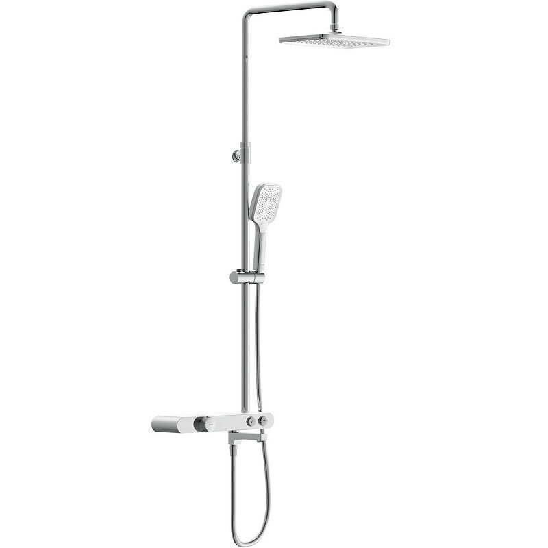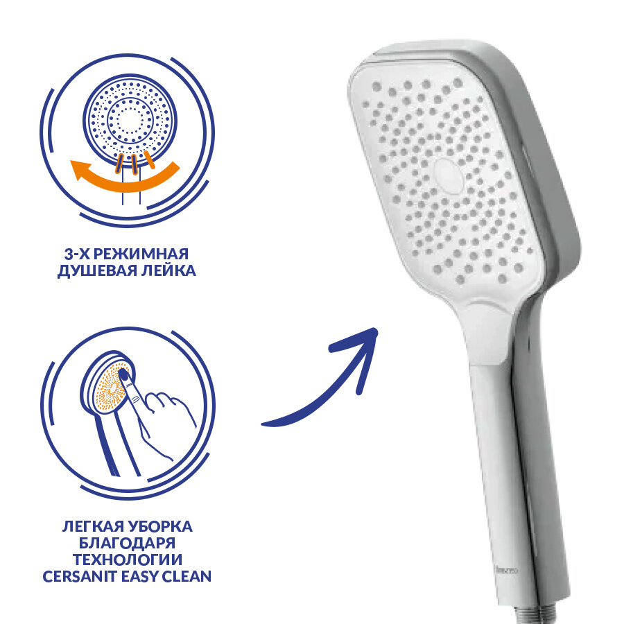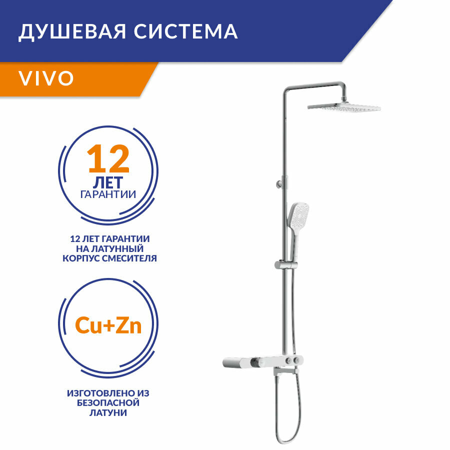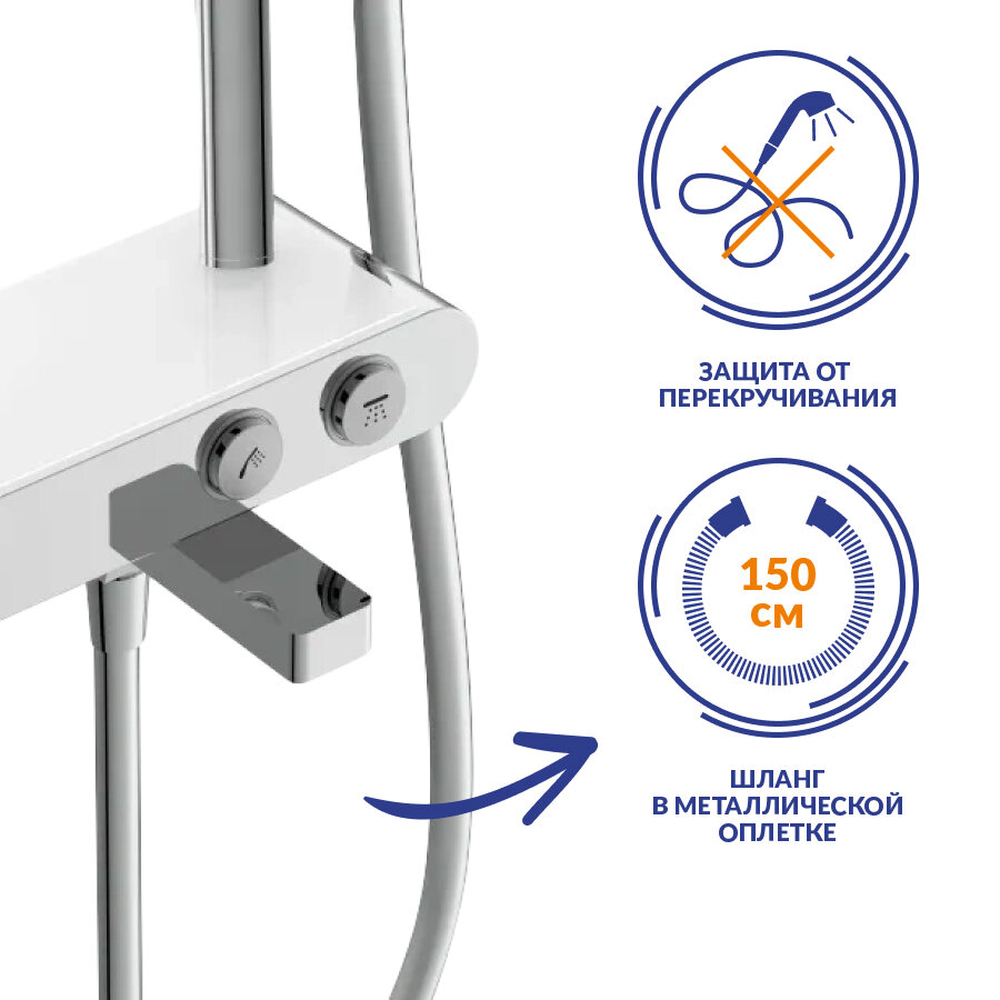 Душевая система с термостатом с изливом для ванны Vivo A64089 Cersanit кнопочное переключение режимов, поворотный излив, 3 режима ручной лейки, полочка из закаленного стекла, регулируемый угол наклона душа, универсальное подключение G ½", защита от нагрева корпуса смесителя Cersanit Safe Touch, двойная оплетка шланга, внутренний шланг из нетоксичного каучука, легкая очистка силиконовых форсунок, комплектация: душевой набор (тропический душ, душевая лейка, подставка для душа, душевой шланг), смеситель.