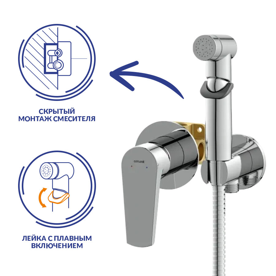 Гигиенический душ MODUO — находка для дизайнера. Особенность этой системы в том, что рукоятку можно установить в отдалении от смесителя. Держатель для компактной лейки встраивается в стену, что позволяет спрятать все коммуникации. Мелкодисперсный аэратор обеспечивает комфортный напор воды, тихую работу и минимизирует брызги. Удобный шланг из нержавеющей стали длиной 1,2 м не ограничит в действиях. Плавный ход рукоятки обеспечивает комфортную подачу и смешивание воды. • Гарантия 12 лет на корпус смесителя, выполненного из латуни — прочного, безопасного и стойкого к коррозии и перепадам давления сплава металлов. Стойкое никель-хромовое покрытие Cersanit Super Shine обеспечивает смесителю зеркальный блеск в течение всего срока службы изделия. Внутренний шланг выполнен из нетоксичного каучука. Качество продукции Cersanit подвергается двойной проверке: сначала на соответствие стандартам проверяется сырьё, затем обследуется вся готовая продукция. Изделия на производстве проходят тестовое испытание на функциональность рабочих элементов и герметичность в закрытом состоянии. Весь модельный ряд смесителей Cersanit соответствует ГОСТ 19681-2016.