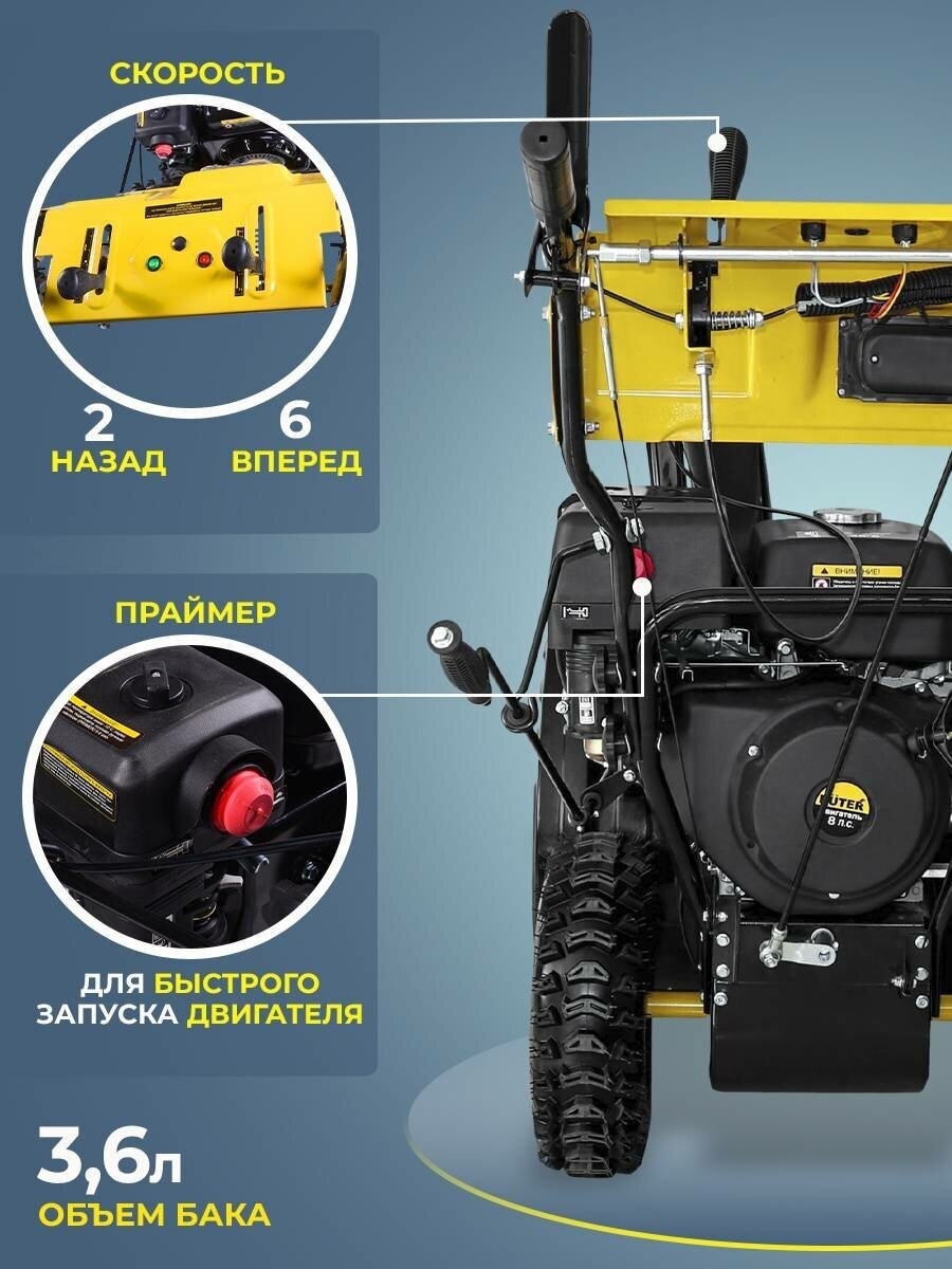 Самоходный колёсный снегоуборщик Huter SGC 8, 0 - универсальный вариант для тех, кому необходимо очищать большие пространства. Оснащён электростартером от сети 220В, который помогает легко и комфортно запускать снегоуборщик даже после длительного нахождения на улице. Прочный металлический шнек измельчает слежавшийся и обледенелый снег, а ручка регулировки даёт возможность изменять сторону выброса во время движения. Яркая фара создаёт комфортные условия для работы на плохо освещенных территориях. Колёса оснащены протекторами, что позволяет им не скользить по льду. Модель имеет максимально количество передних скоростей: 6 вперед и 2 назад. Увеличенный ковш (62 смx54 см) и мощный двигатель (8 л.с.) позволяет очищать любую территорию за короткий срок.