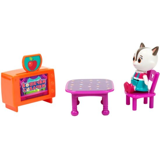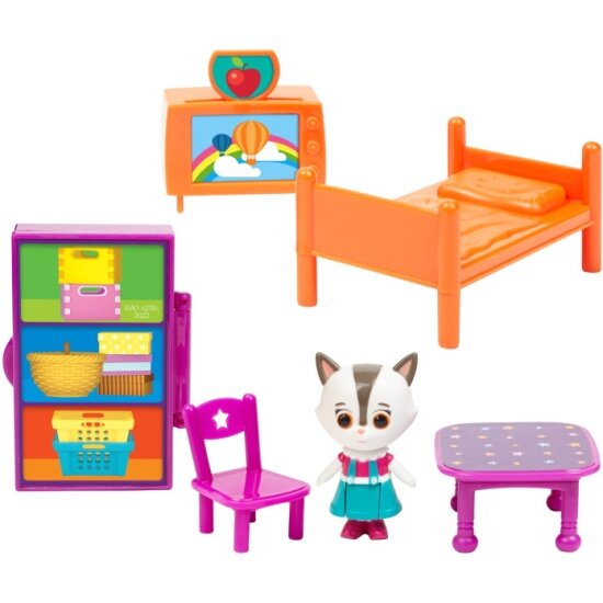 В наборе «Комната» ТМ Кошечки-Собачки 6 предметов: шкаф, кровать, стол, стул, телевизор, а также фигурка Алисы высотой 5,5 см, которая может стоять, сидеть, двигать ручками, ножками и головой. В набор входит картонная декорация, которую можно использовать в качестве игрового поля. Набор выполнен из качественного и прочного пластика. Товар сертифицирован и предназначен для детей от 3 лет. Упаковка – коробка с окном (25x13x18 см).