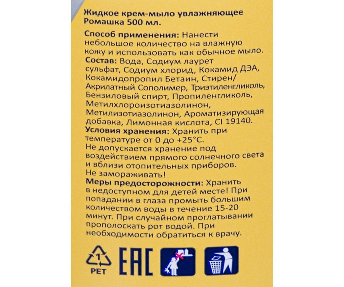 Крем-мыло Luscan Ромашка 500 млНазначение Крем-мыло с экстрактом ромашки эффективно очищает и смягчает кожу, глубоко увлажняет ее, а также создает на ней особый антибактериальный барьер. Благодаря мягкой моющей основе с активными веществами, мыло идеально подходит для ежедневного применения.Способ применения Нанести небольшое количество на влажную кожу и использовать как обычное мыло.Меры предосторожности Хранить в недоступном для детей месте! При попадании в глаза промыть большим количеством воды в течение 15-20 минут. При случайном проглатывании прополоскать рот водой. При необходимости обратиться к врачу.Состав Вода, содиум лаурет сульфат, содиум хлорид, кокамид дэа, кокамидопропил бетаин, стирен/акрилатный сополимер, триэтиленгликоль, бензил алкоголь, пропиленгликоль, метилхлороизотиазолинон, метилизотиазолинон, ароматизирующий компонент, лимонная кислота, CI 19140.Условия хранения Хранить при температуре от 0 до 25 °С. Не допускается хранение под воздействием прямого солнечного свет аи вблизи отопительных приборов. Не замораживать!Срок годности 18 месяцев при соблюдении условий хранения и правил транспортировки.