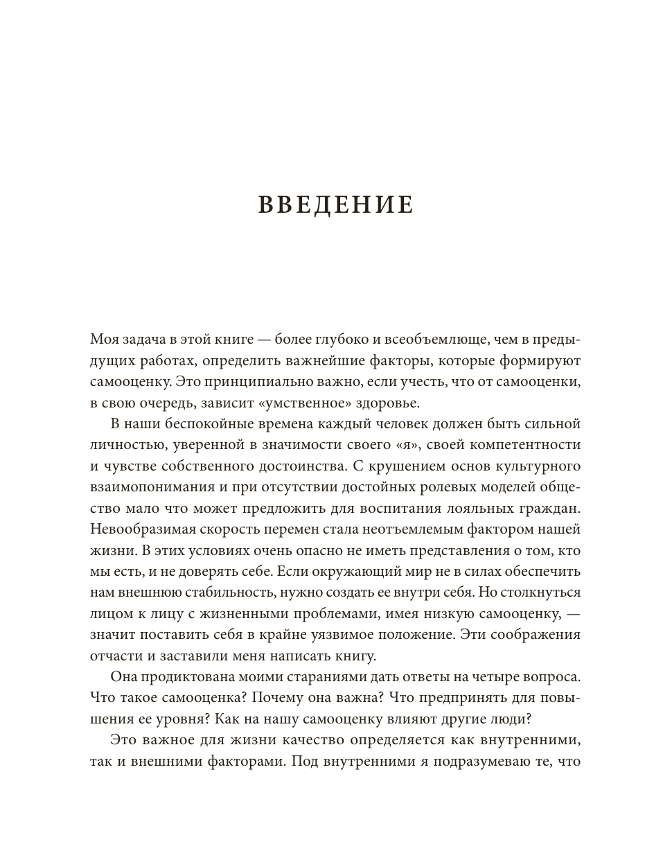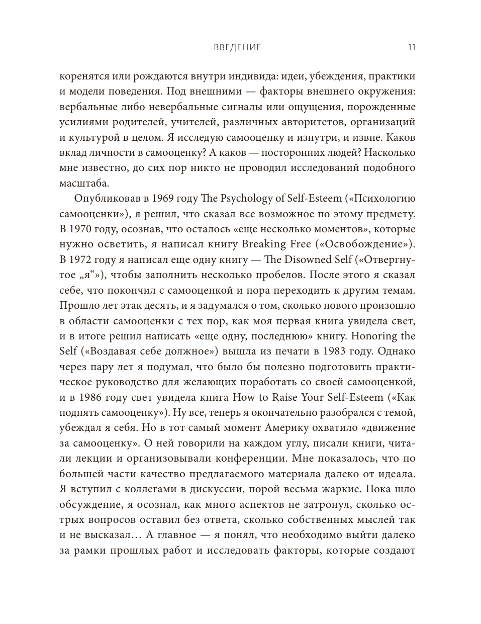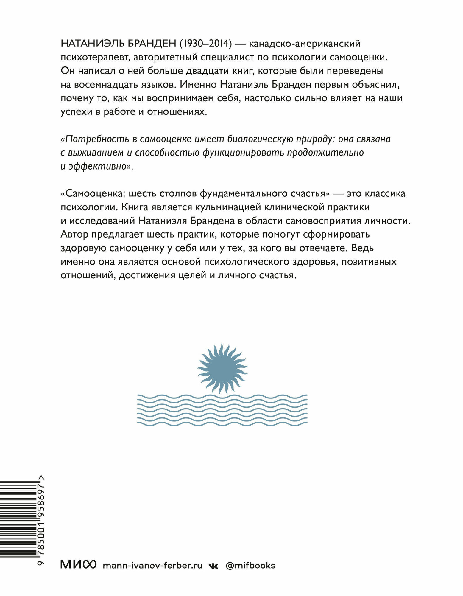 Натаниэль Бранден (1930-2014) - канадско-американский психотерапевт, авторитетный специалист по психологии самооценки. Был сторонником объективизма Айн Рэнд, ее соратником и партнером. После разрыва с Рэнд посвятил свою деятельность изучению самооценки и написал о ней больше двадцати книг, которые переведены на восемнадцать языков.