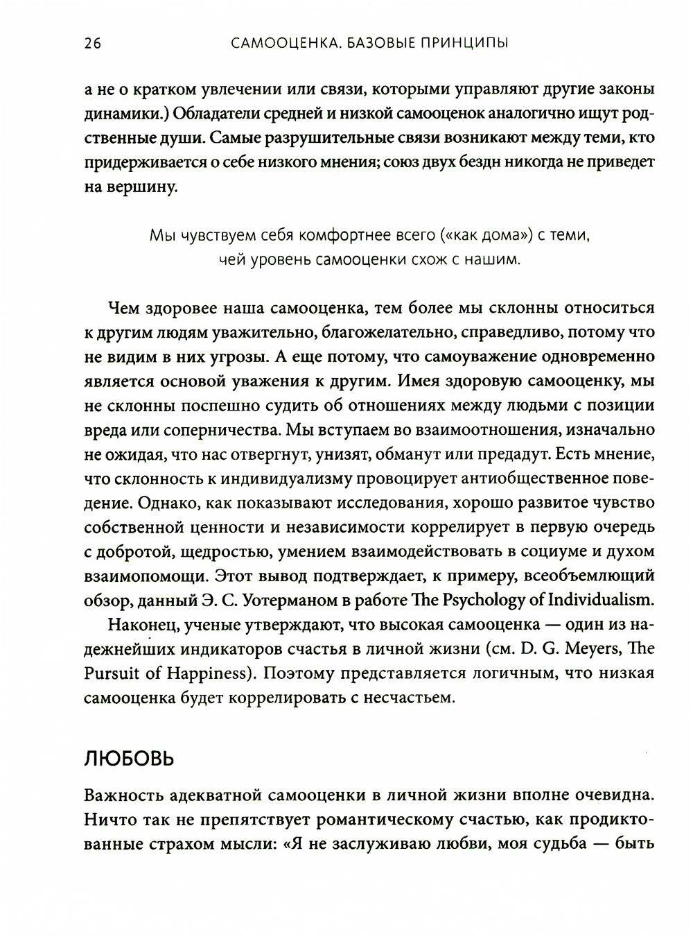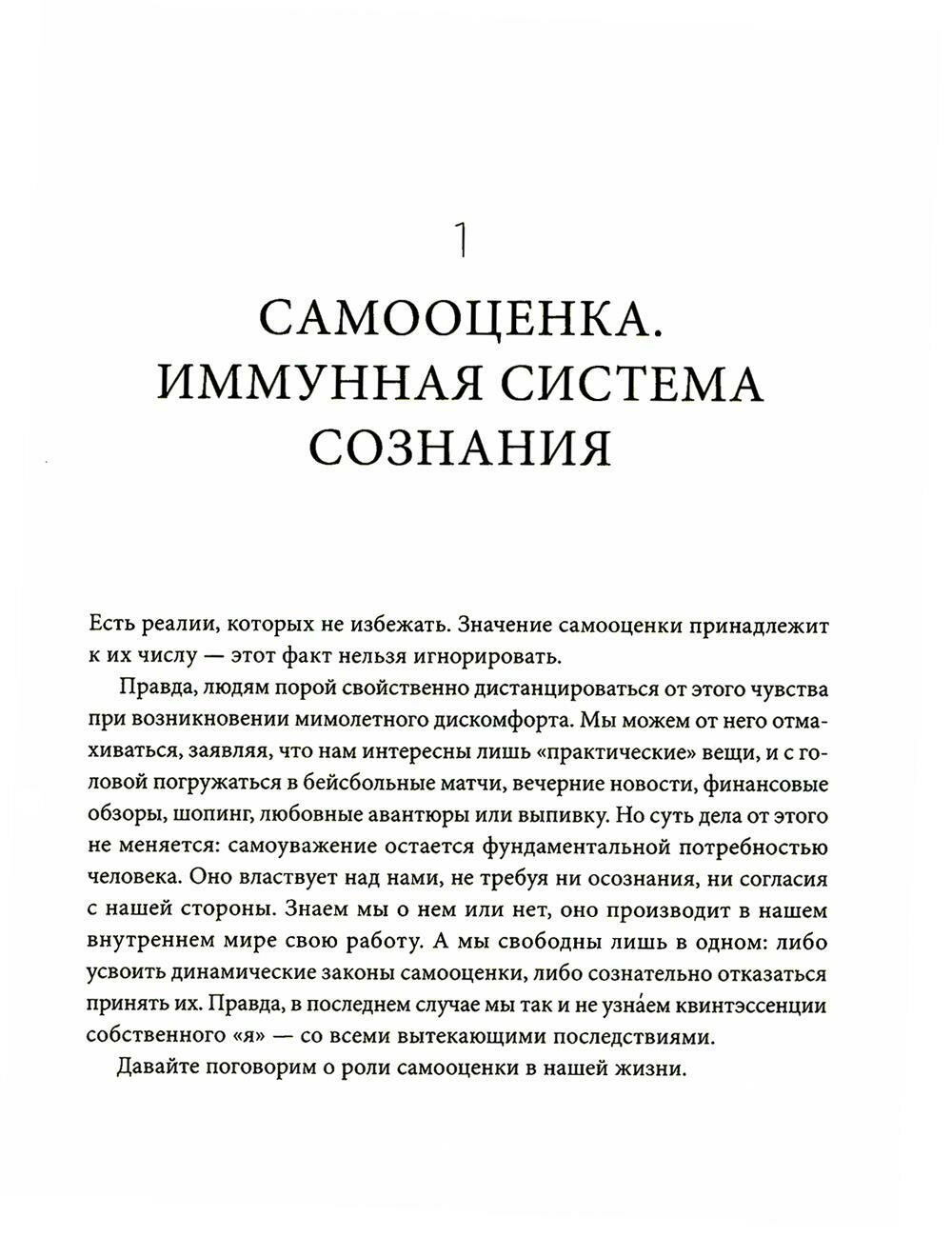 Книга Натаниэля Брандена - классика психологии. Без здоровой самооценки невозможно справиться с вызовами изменчивого мира и развиваться. Нужно воздать должное своему "я", научиться доверять собственному разуму и твердо знать, что ты достоин счастья. Для этого автор предлагает шесть простых практик и рекомендации для родителей, учителей, руководителей и психотерапевтов.