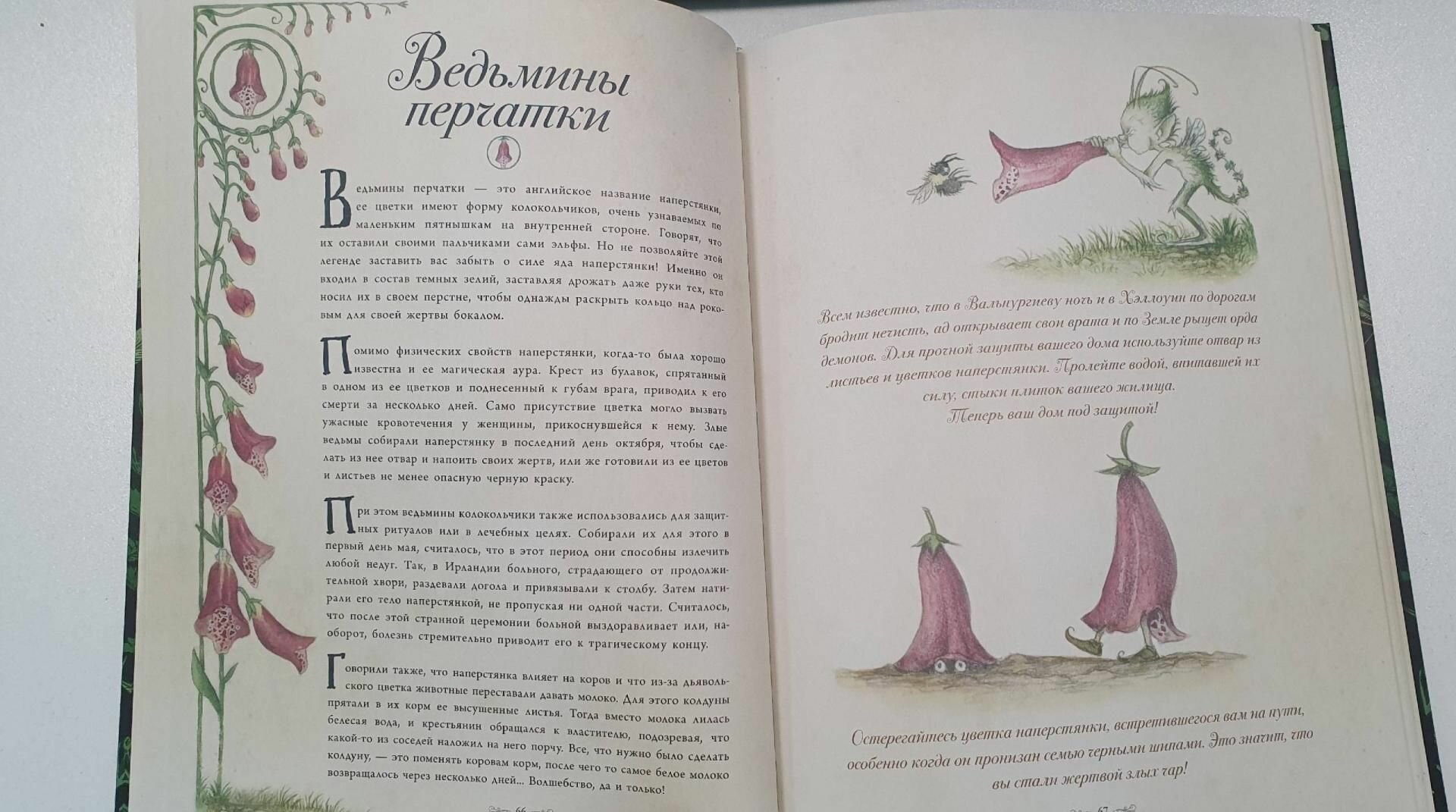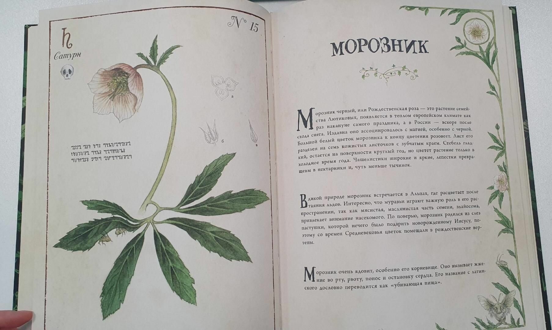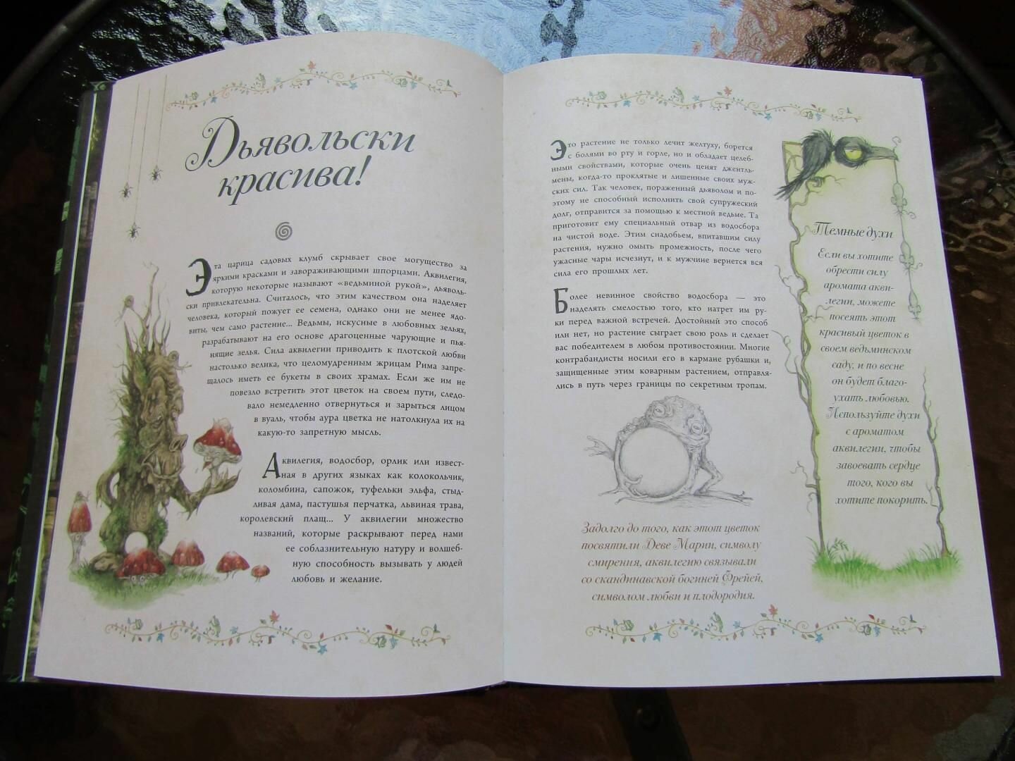 Книга напоминает ту, которую мы часто видим в фильмах про средневековых ведьм: на одной стороне большой рисунок самого цветка/травы, как в ботанических учебниках, с другой стороны её свойства; на следующей странице легенды, мифы и советы связанные с этим растением. То, что придаёт особый шарм данной книге - это иллюстрации, которые есть на каждой странице, я в них влюбилась))
