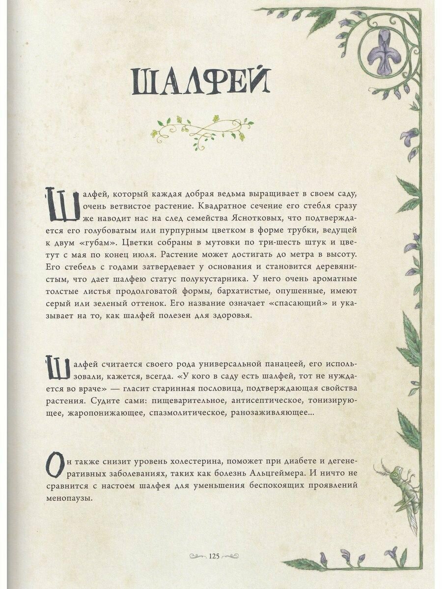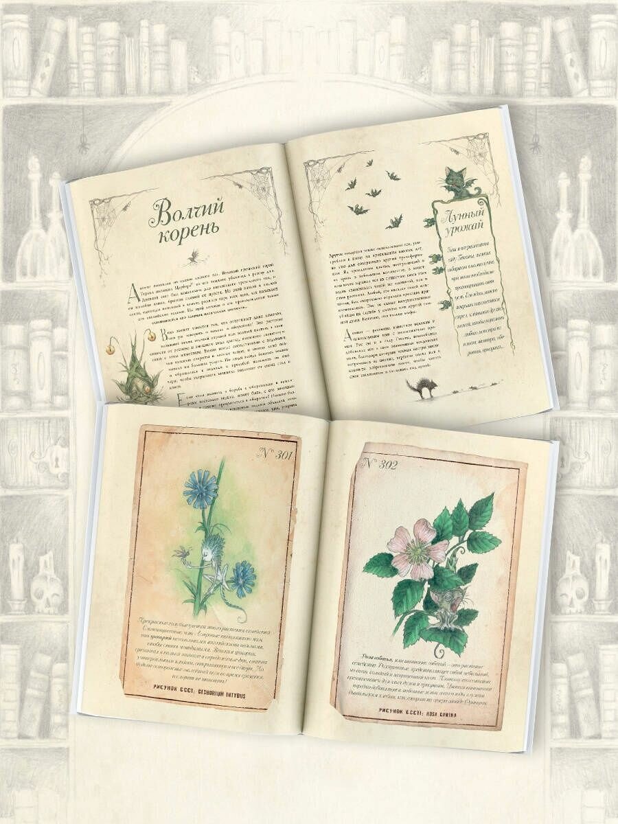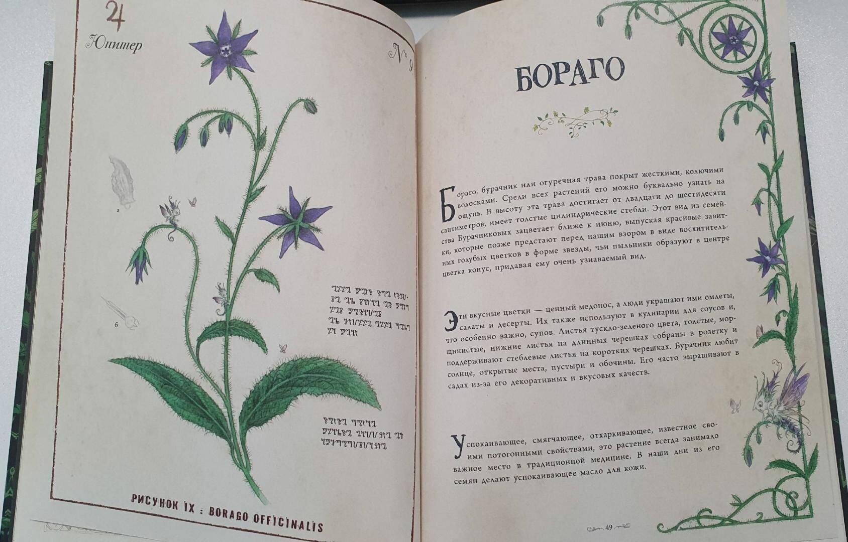 Книга напоминает ту, которую мы часто видим в фильмах про средневековых ведьм: на одной стороне большой рисунок самого цветка/травы, как в ботанических учебниках, с другой стороны её свойства; на следующей странице легенды, мифы и советы связанные с этим растением. То, что придаёт особый шарм данной книге - это иллюстрации, которые есть на каждой странице, я в них влюбилась))