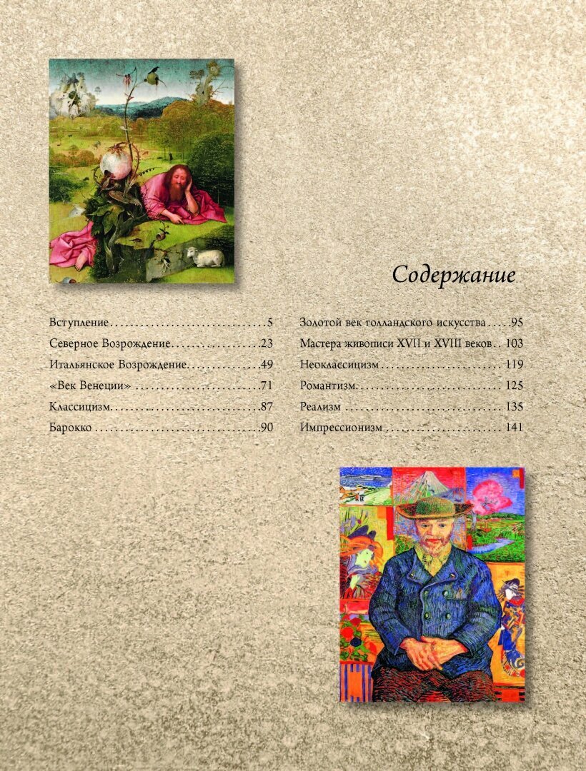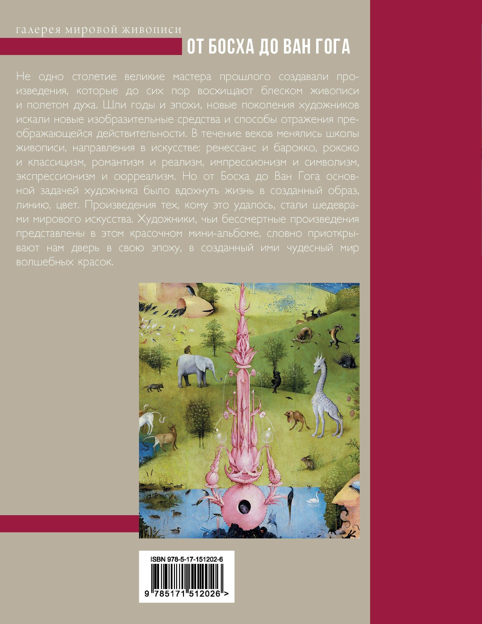 Не одно столетие великие мастера прошлого создавали произведения, которые до сих пор восхищают блеском живописи и полетом духа. Эпохи сменяли друг друга, новые поколения художников искали новые изобразительные средства и способы отражения меняющейся действительности. В течение веков менялись школы живописи, направления в искусстве: ренессанс и барокко, рококо и классицизм, романтизм и реализм, импрессионизм и символизм, экспрессионизм и сюрреализм. Но от Босха до Ван Гога основной задачей художника было вдохнуть жизнь в созданный образ, линию, цвет. Произведения тех, кому это удалось стали шедеврами мирового искусства. Художники, чьи бессмертные произведения представлены в этом красочном мини-альбоме, словно приоткрывают нам дверь в свою эпоху, в созданный ими чудесный мир волшебных красок.