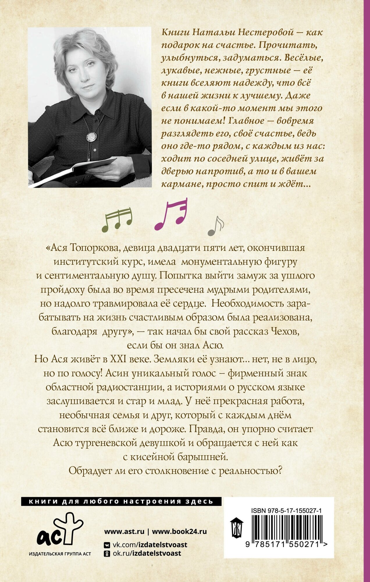 Но Ася живёт в ХХI веке. Земляки её узнают… нет, не в лицо, но по голосу! Асин уникальный голос - фирменный знак областной радиостанции, а историями о русском языке заслушивается и стар и млад. У неё прекрасная работа, необычная семья и друг, который с каждым днём становится всё ближе и дороже. Правда, он упорно считает Асю тургеневской девушкой и обращается с ней как с кисейной барышней. Обрадует ли его столкновение с реальностью?
