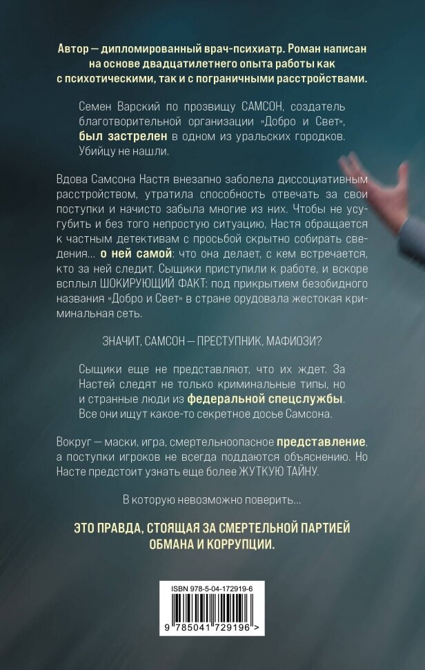Вдова Самсона Настя внезапно заболела диссоциативным расстройством, утратила способность отвечать за свои поступки и начисто забыла многие из них. Чтобы не усугубить и без того непростую ситуацию, Настя обращается к частным детективам с просьбой скрытно собирать сведения… о ней самой: что она делает, с кем встречается, кто за ней следит. Сыщики приступили к работе, и вскоре всплыл шокирующий факт: под прикрытием безобидного названия «Добро и Свет» в стране орудовала жестокая криминальная сеть.