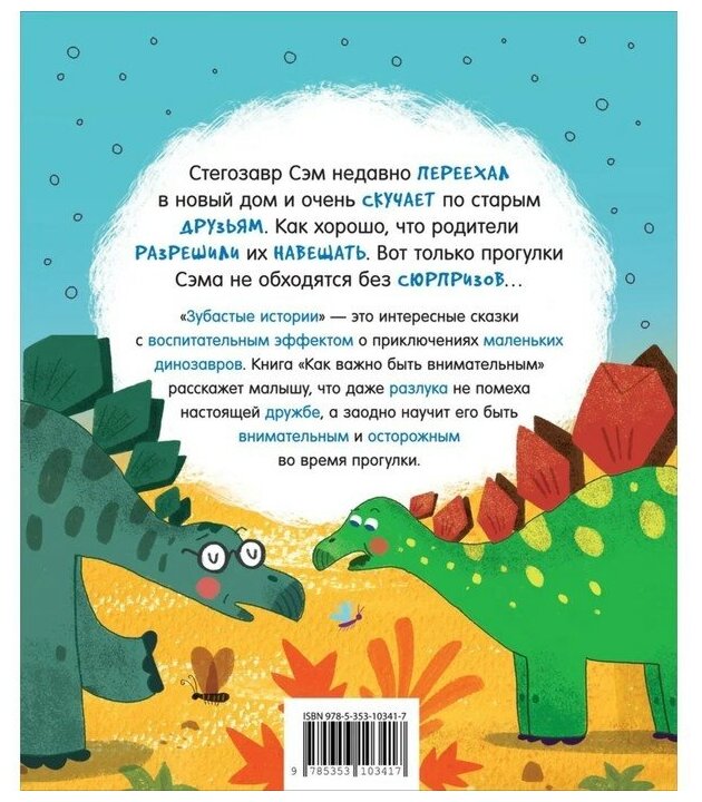 «Зубастые истории» это интересные сказки с воспитательным эффектом о приключениях маленьких динозавров. Книга «Как важно быть внимательным!» расскажет малышу, что даже разлука не помеха настоящей дружбе, а заодно научит его быть внимательным и осторожным во время прогулки.
