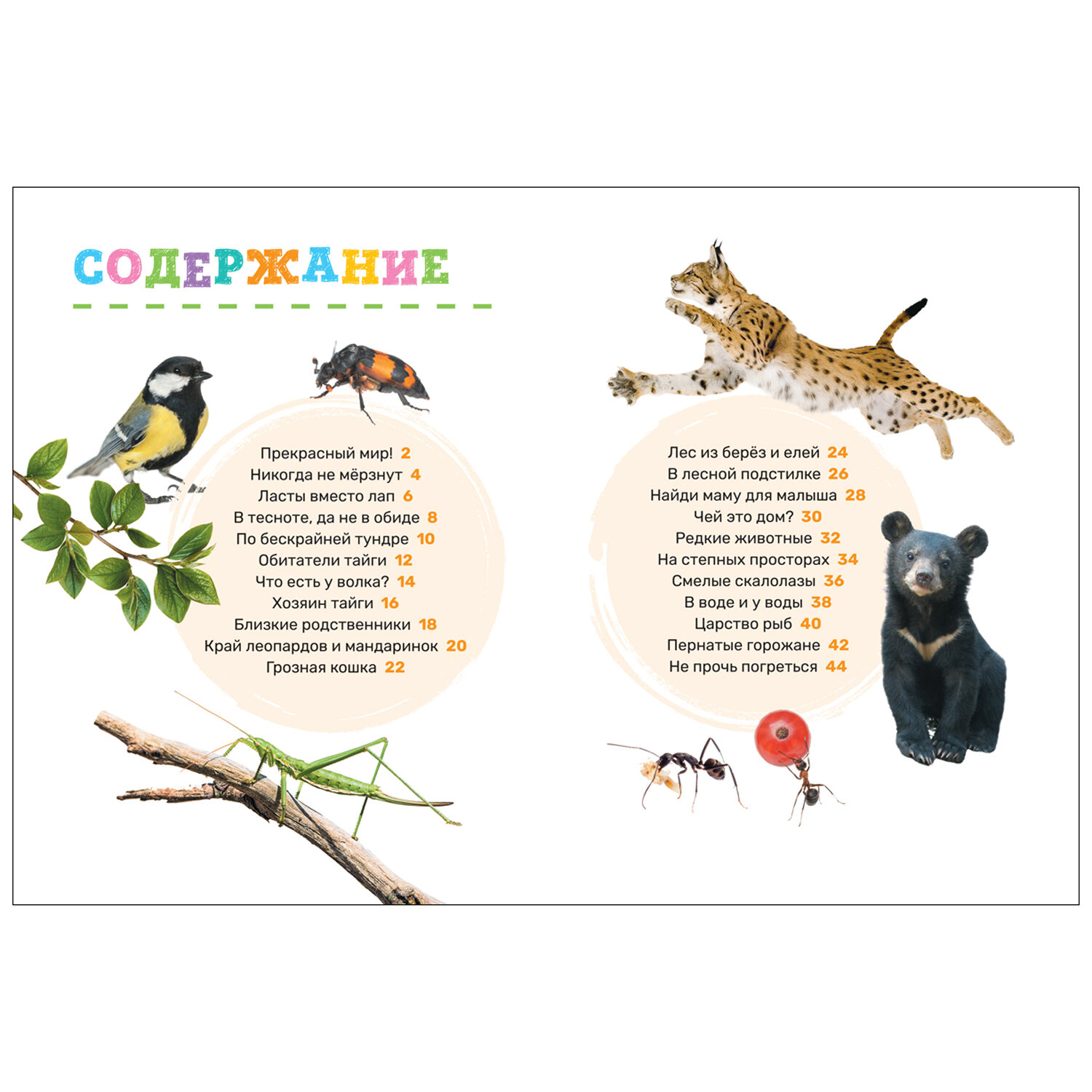 Любознательному ребенку эта книга подарит возможность поближе познакомиться с миром животных. Он узнает, какие животные не мерзнут в холода, а какие не изнывают от жары. Книга расскажет, за что глухарь получил такое название, где живет самая крупная на Земле кошка и много ли родственников у белки. В книге много ярких иллюстраций с подробными подписями. После знакомства с каждой темой даются интересные задания, малыши с удовольствием будут их выполнять, повторяя и усваивая прочитанное.