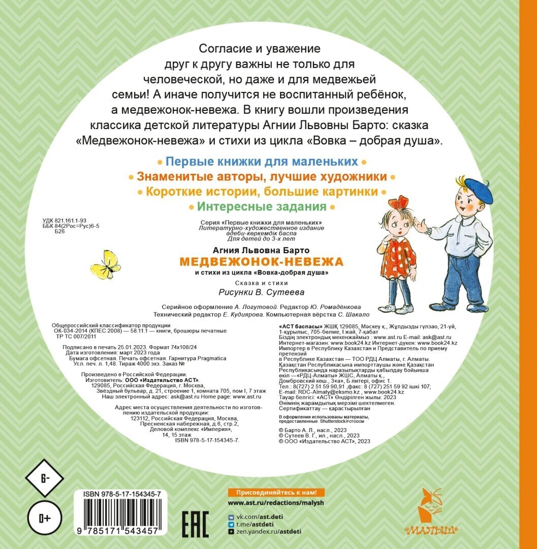 На сегодняшний день товар «Книга: Медвежонок-невежа. Сказка и стихи. Рисунки В. Сутеева (Барто Агния Львовна); ИЗДАТЕЛЬСТВО "АСТ", 2023» можно купить с кешбеком в 2 магазинах: book24, Буквоед