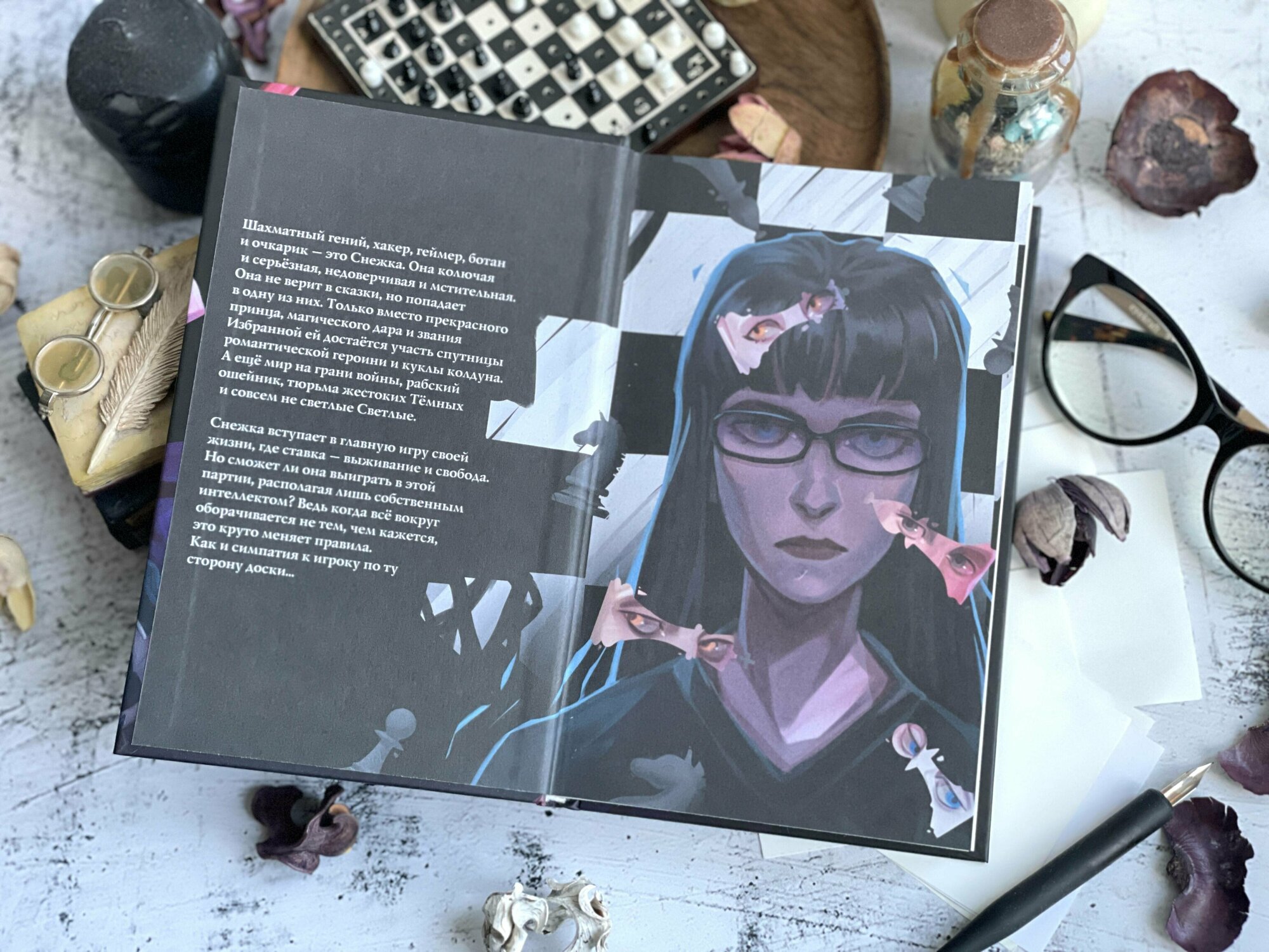 «Снежка – Шахматный гений, хакер, опытный геймер, ботан. Колючая и серьёзная, недоверчивая и мстительная, без иллюзий и сантиментов. Стечением обстоятельств попадает в «сказку». Правда, не совсем весёлую: там вместо любви прекрасного принца – участь куклы колдуна, вместо магического дара – рабский ошейник. А ещё мир на грани войны, жестокие Тёмные и совсем не светлые Светлые.