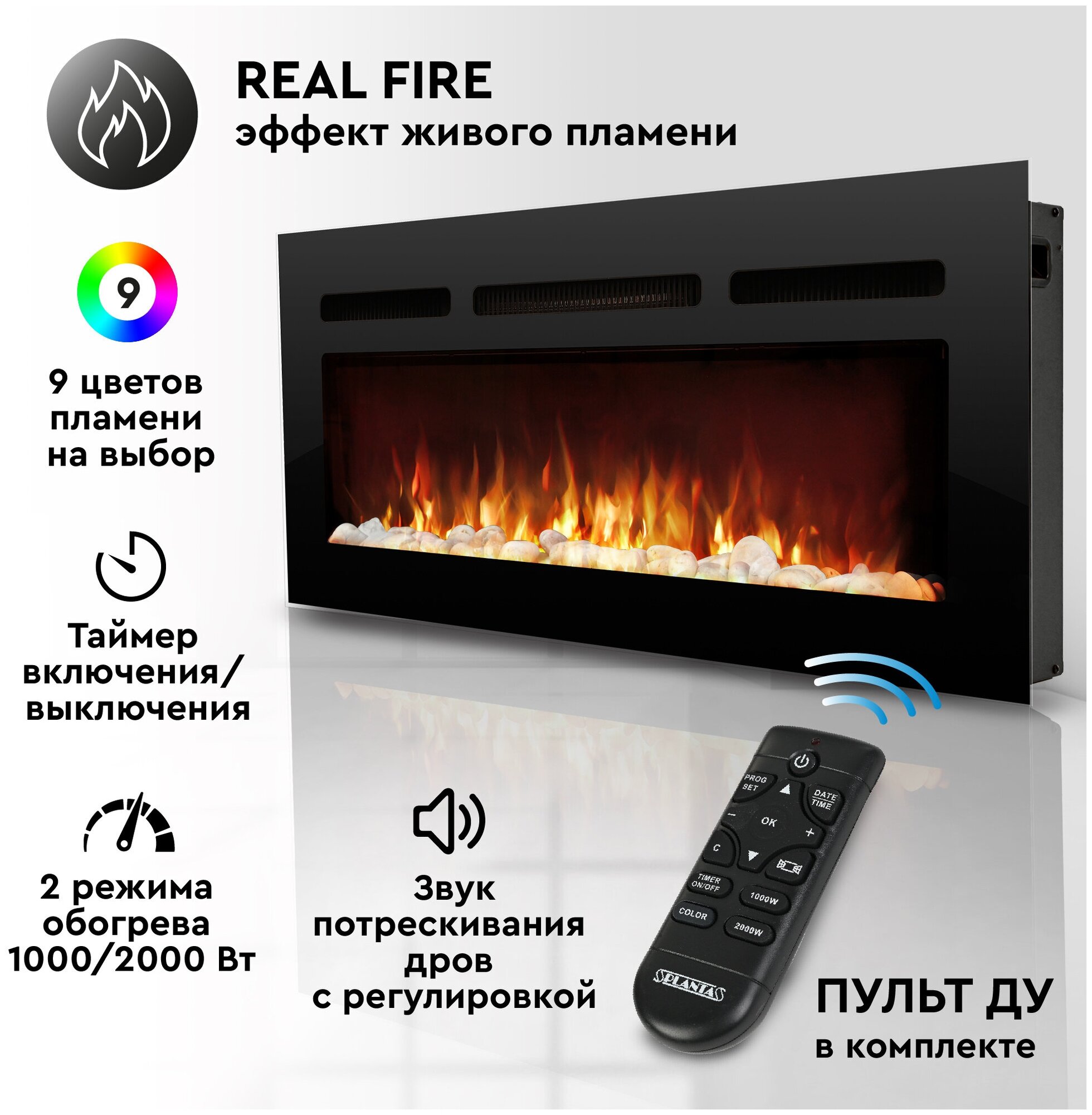 Реалистичный эффект пламени Real Fire с возможностью выбора одного из 9 цветов пламени, функция «Звук потрескивания дров» с возможностью регулировки громкости (5 уровней громкости) и отключения звука.