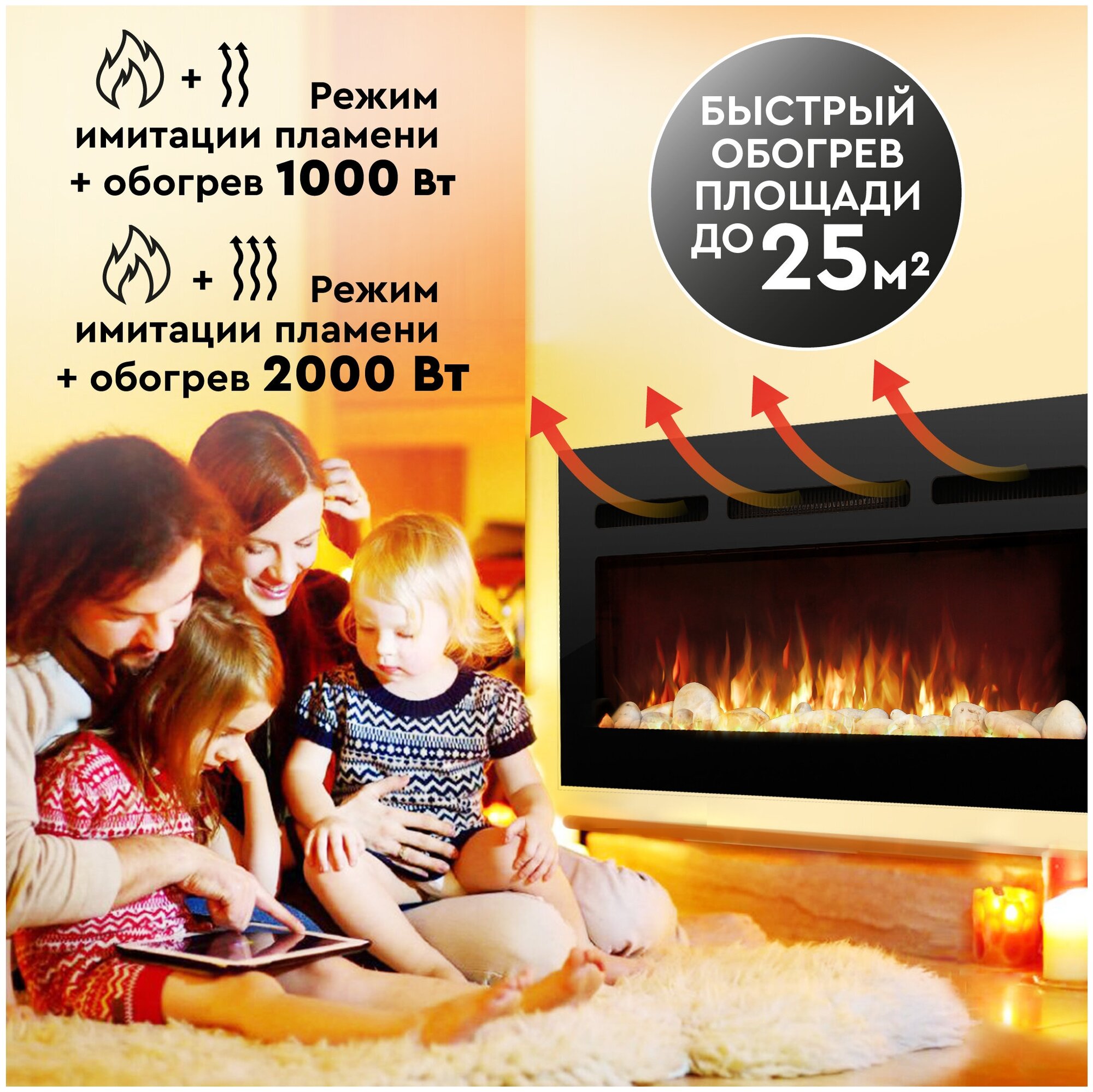 Вы можете выбрать один из трех режимов: режим имитации пламени 10 Вт , режим имитации пламени + обогрев 1000 Вт или режим имитации пламени + обогрев 2000 Вт. Данный камин быстро обогреет помещение площадью до 25 кв. м.