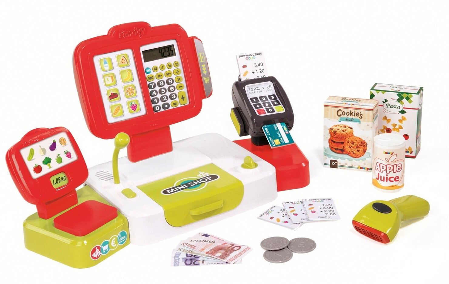 Дети очень любят играть в магазин. Электронная касса Smoby — это замечательная игрушка со световыми и звуковыми эффектами, предназначенная для сюжетно-ролевых игр, связанных с магазином. Ребенок сможет примерить на себя роль продавца, кассира или покупателя. Игра помогает научиться обращаться с деньгами и отлично развивает социальные навыки ребенка, поскольку идеально подходит для коллективных игр с друзьями.