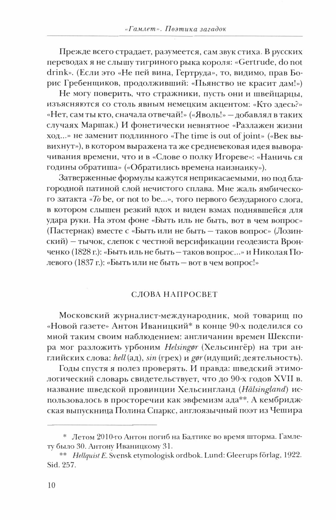 «Гамлет» — самая знаменитая пьеса Шекспира. Андрей Чернов и издательство «Нестор-История» предлагают новый ее комментированный перевод. В действии на сцене откликаются факты шекспировской биографии и исторические реалии конца XVI в. — казнь Марии Стюарт, революция в Нидерландах, война с Испанией. Пьеса стала предостережением шотландскому королю Якову VI. Отказавшись от мести за смерть матери, король предотвратил гражданскую войну между Англией и Шотландией. Выдвигается гипотеза о посещении поэтом Дании в 1590 г. и постановке «Гамлета» в замке Кронборг на свадьбе Якова VI и Анны Датской.