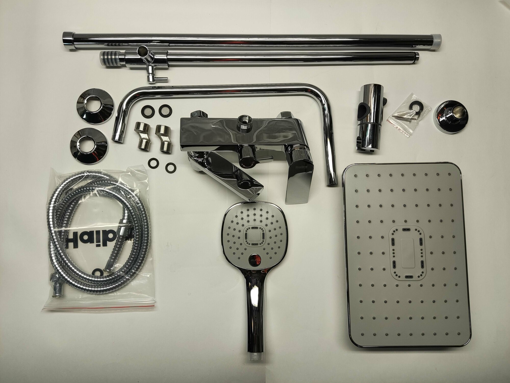 Душевая стойка Haiba HB24505, хром. Верхний душ, душевая штанга, держатель душевой лейки, ручной душ, смеситель, шланг. Душевая система Haiba. Изготовлена из высококачественной нержавеющей стали. Прекрасный тропический душ. Излив для наполнения ванны. Душевая штанга регулируется по высоте от 88,2 см до 153,2 см.