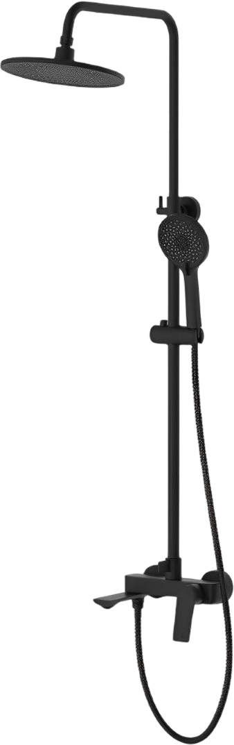 Душевая стойка Haiba HB24816-7, черный. Верхний душ, душевая штанга, держатель душевой лейки, ручной душ, смеситель, шланг. Душевая система Haiba. Изготовлена из высококачественной нержавеющей стали. Прекрасный тропический душ. Излив для наполнения ванны. Душевая штанга регулируется по высоте от 88,2 см до 153,2 см.