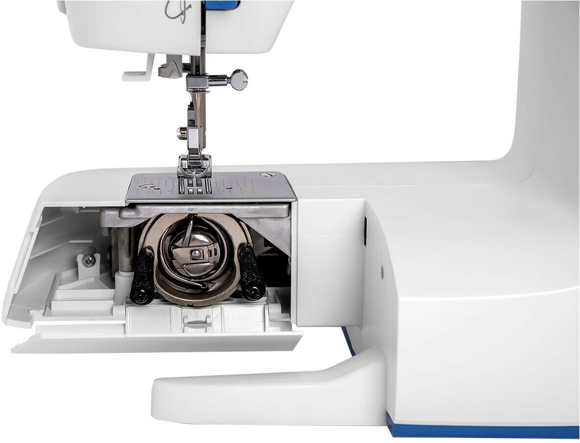 | Комплект поставки | стандартная лапка, большой и маленький держатели катушки, вспарыватель шва со щеткой для чистки машины, машинное масло, лапка для выметывания петли, дополнительный стержень для шитья двойной иглой, лапка для пришивания молнии, лапка для пришивания пуговицы, отвертка, шпульки, направляющая для квилтинга, запасные иглы, пластина для штопки и вышивки, фетровая подушечка для катушки. |