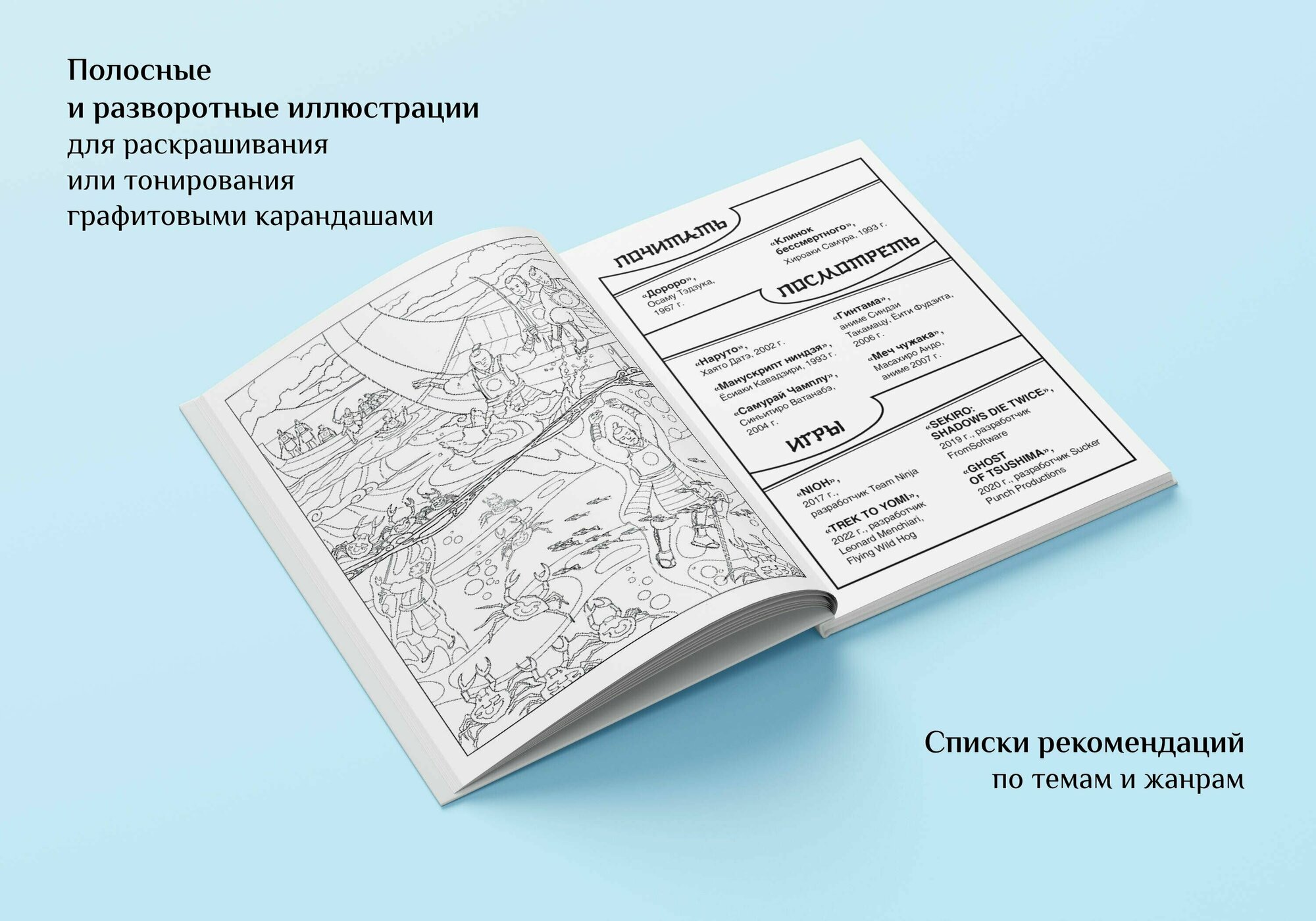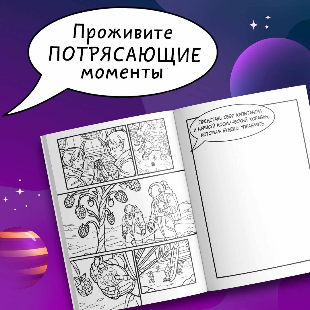 - Полосные и разворотные иллюстрации для раскрашивания, готовые комиксы и шаблоны раскадровок, творческие задания на проработку сюжетных линий и персонажей.