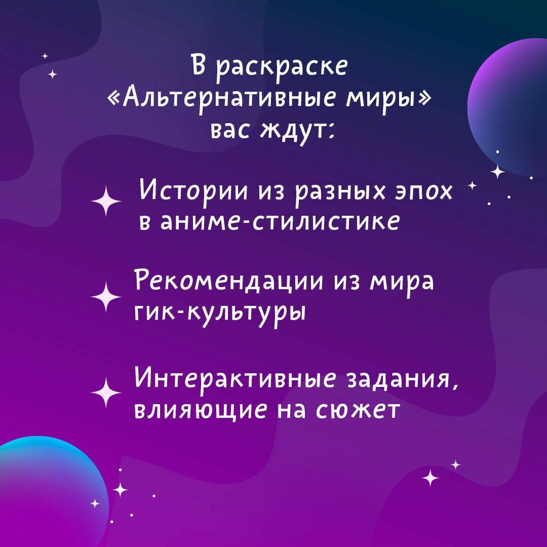 Раскраска "Альтернативные миры" объединяет героев разных эпох и миров - 14 сюжетов даны в иллюстрациях современных художников. Преврати путешествие во времени в реальность, раздвинь границы пространства, погрузись в мир фантазий и в одно мгновение окажись в своем новом альтернативном мире!