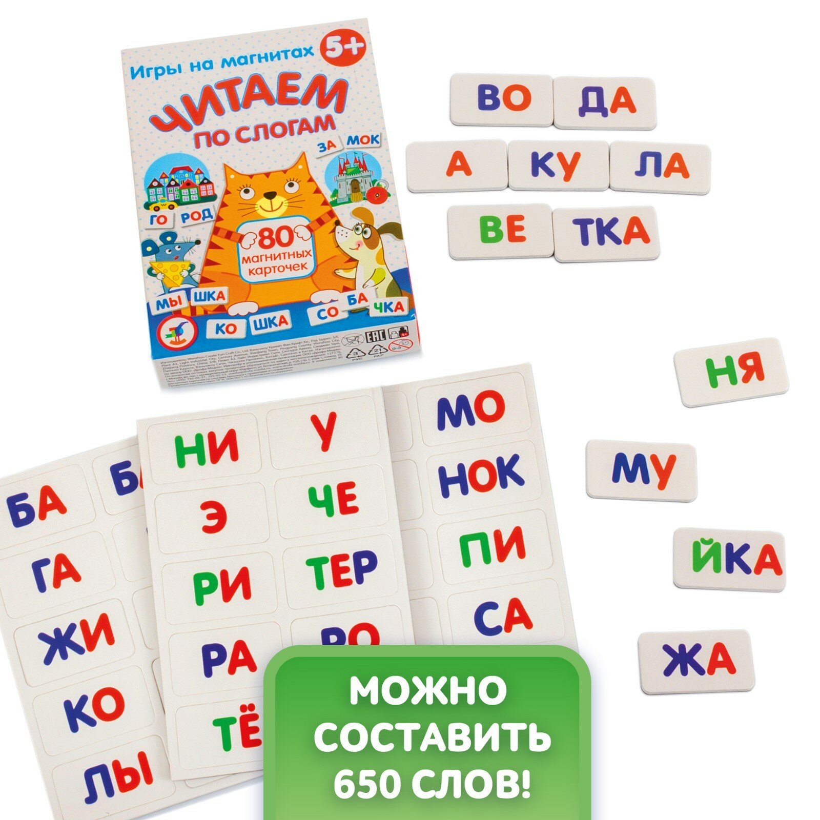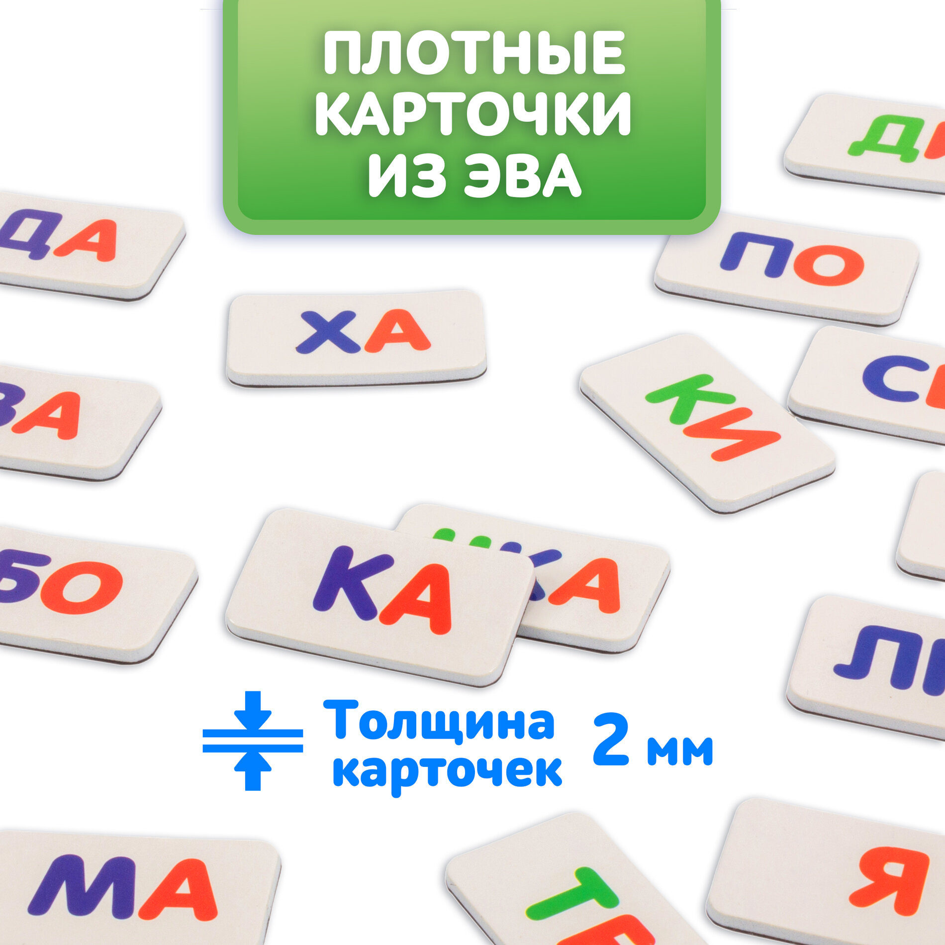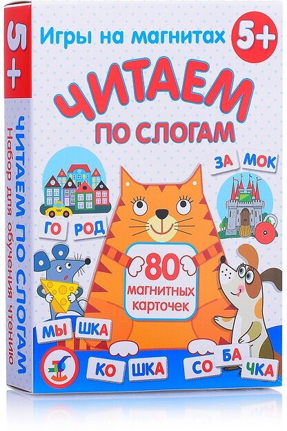 В комплекте: 80 магнитных карточек со слогами (обратная сторона карточки полностью магнитная).
