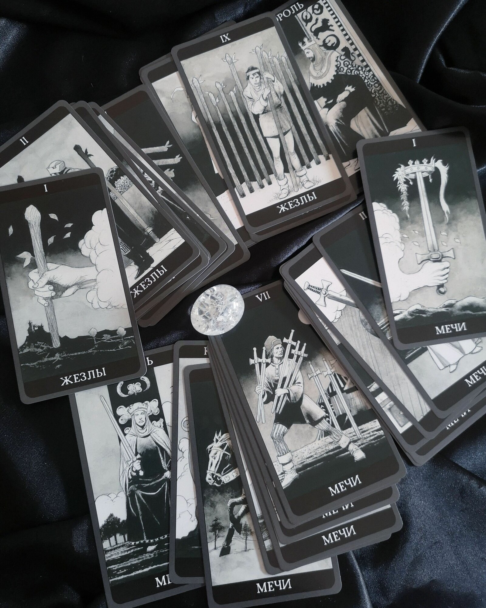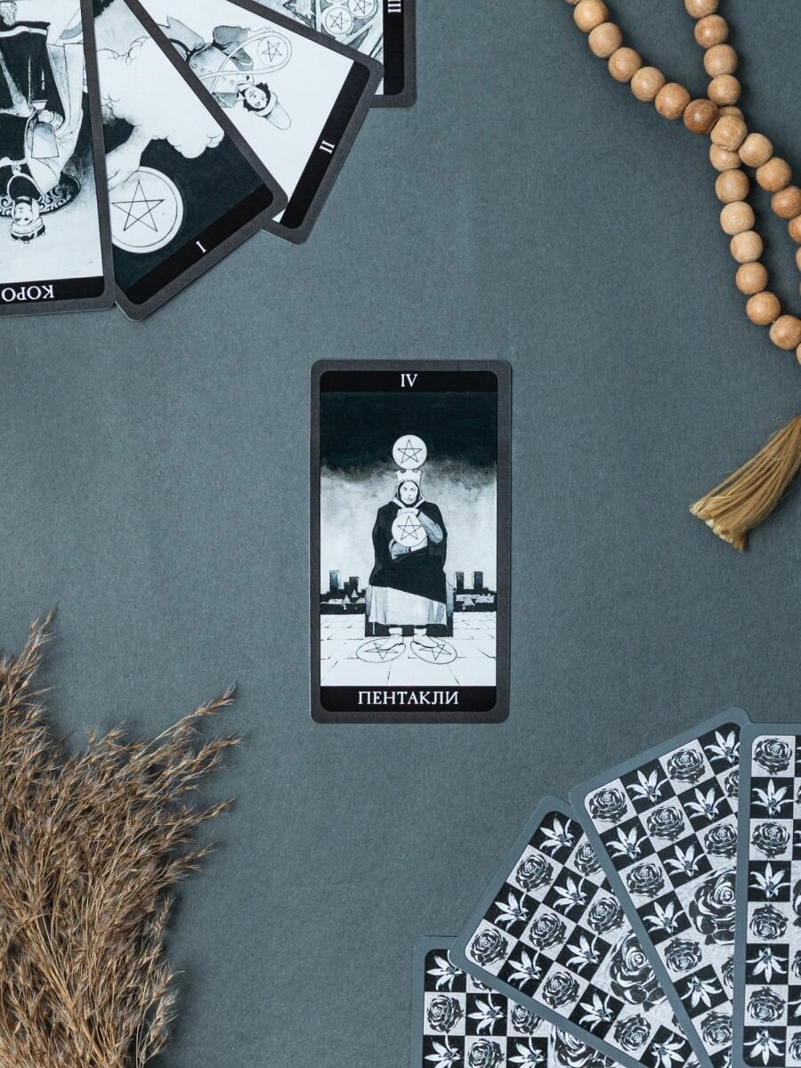 Замечательная колода карт! Монохромность, по моему субъективному мнению, даёт даже больше глубины, чем пестрата стандартной цветной колоды. Изображения - четкие, срез - ровный. Очень понравилось, что карты плотные, но не слишком жестокие, это позволяет довольно легко перемешивать их методом рифл шафл. Также, замечательно, что в комплекте есть полноценная книга - инструкция. Для меня так гораздо удобнее, чем по кюару.