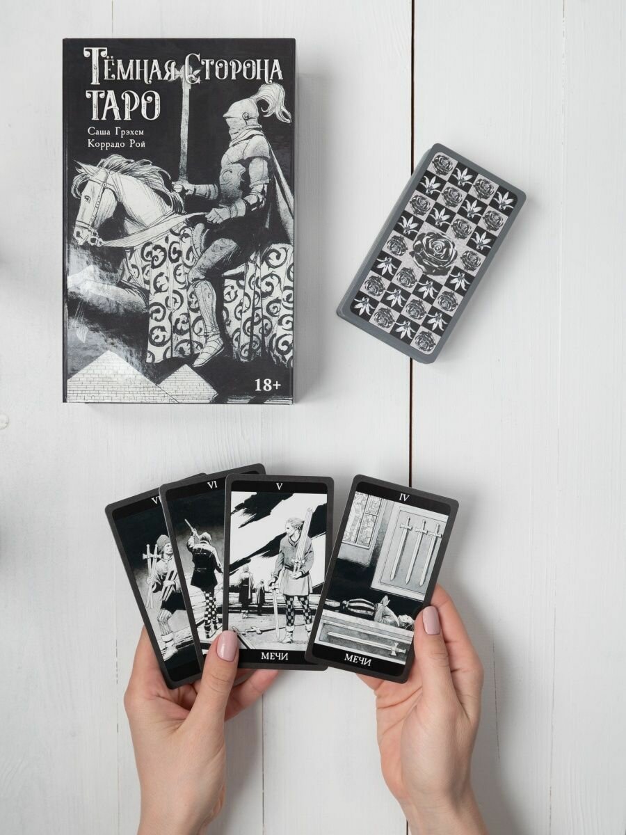 Работа Коррадо Рои приглашает всех окунуться в Тёмную Сторону Таро. Эта колода, продолжающая традиции Таро А.Э. Уэйта и П.К. Смит, но выполненная в монохромном варианте, показывает нам тёмные стороны нашего бытия, порой пугающие, но необходимые, чтобы проникнуть в самые глубины подсознания. Автор книги - всемирно известный эксперт по Таро Саша Грэхем.