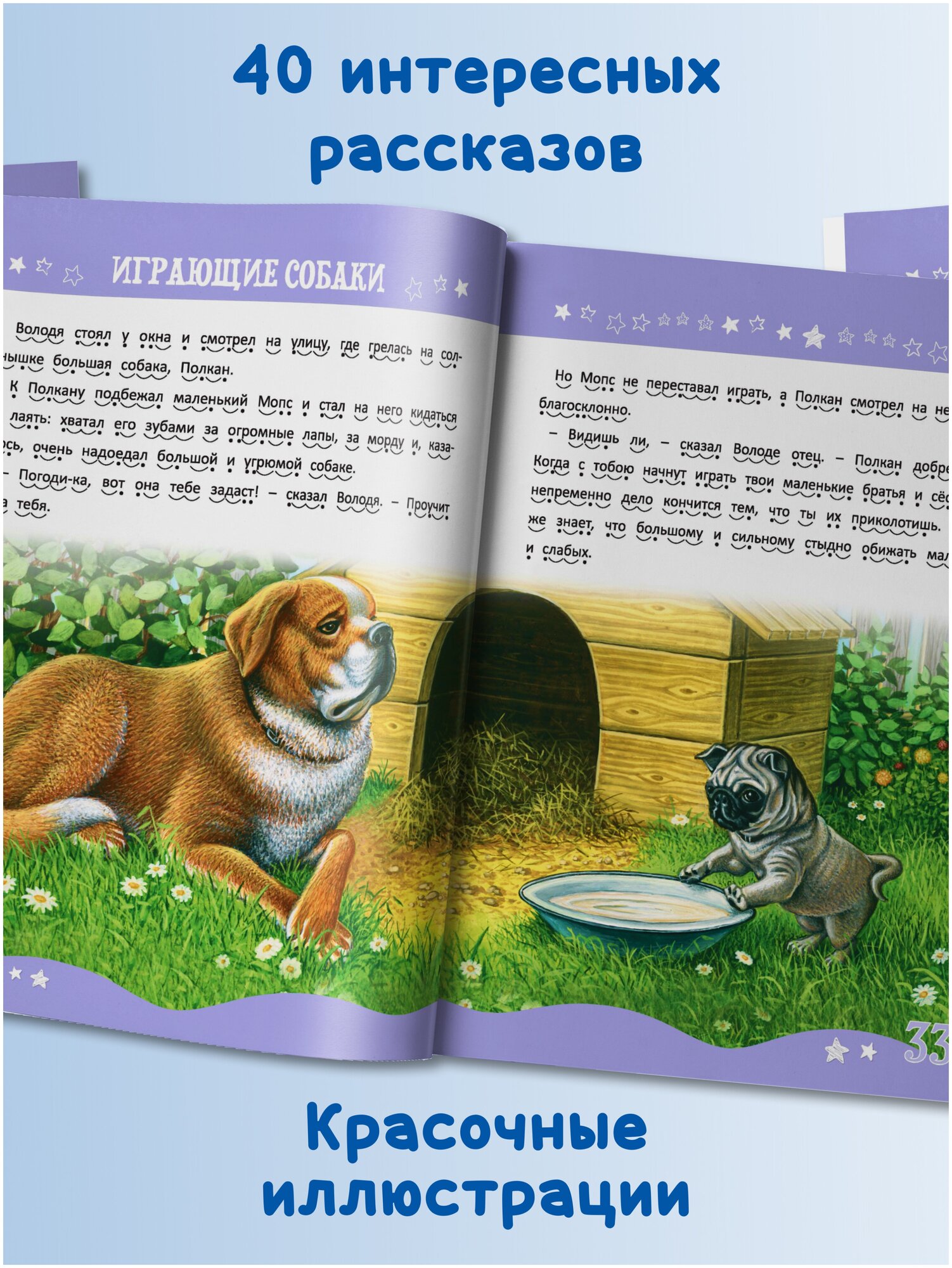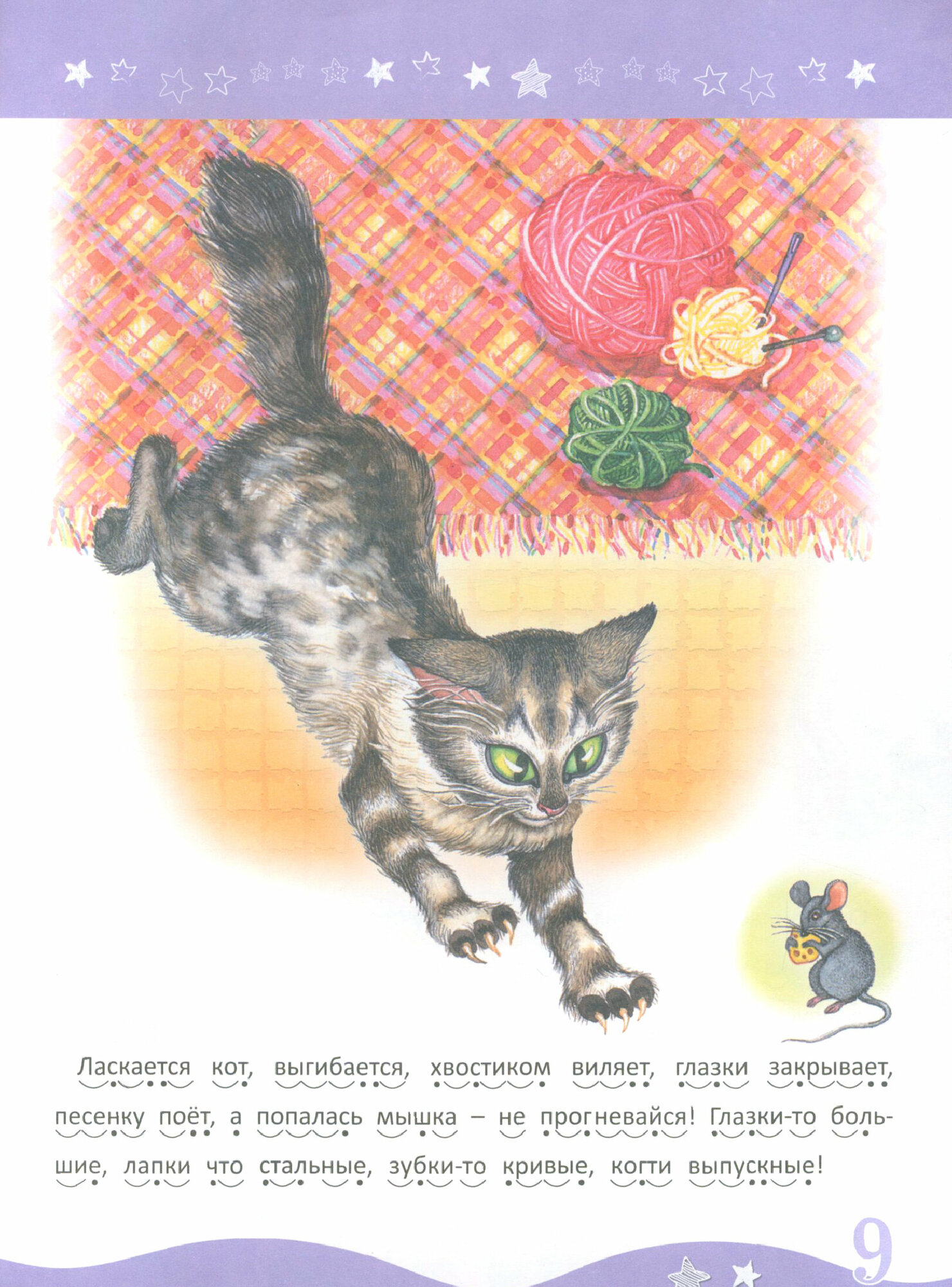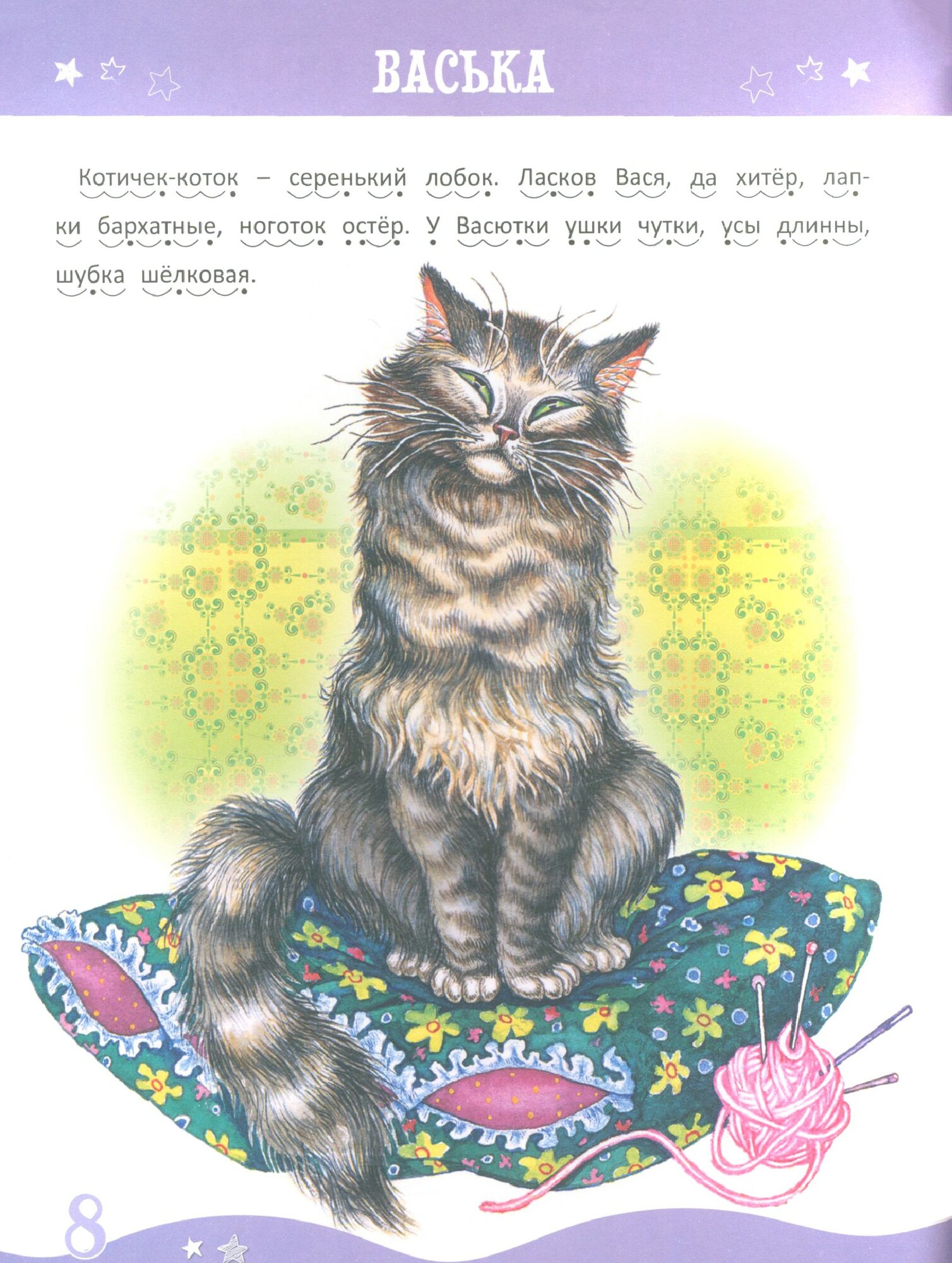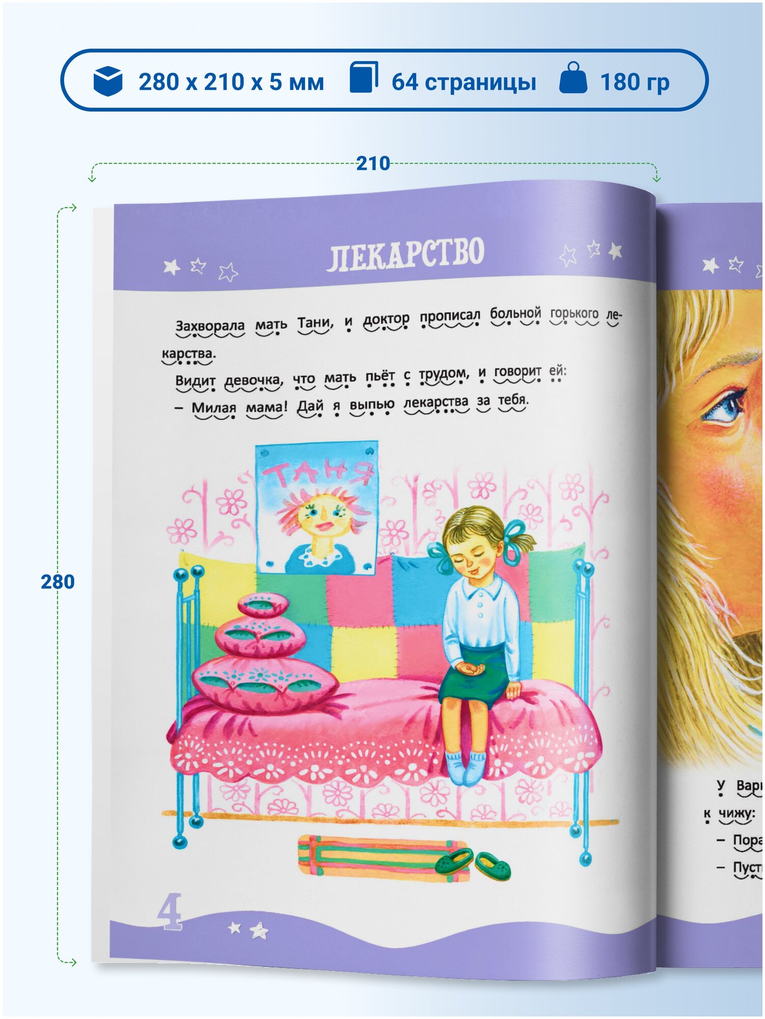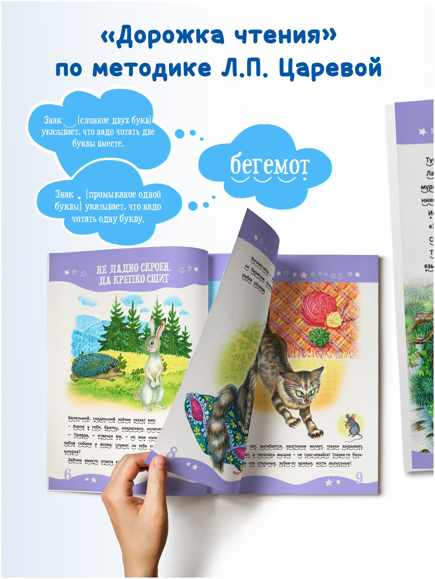 Данная книга предназначена детям, уже освоившим азбуку. Текст набран крупным, удобным для детского восприятия шрифтом с использованием "дорожки чтения" по методике Л. П. Царевой. Для формирования навыка беглого и осмысленного чтения слова текста не разбиваются на слоги, а раз-мечаются специальными символами, создающими "дорожку чтения". Переводя указку по "дорожке", ребенок читает, например, слово "бегемот".