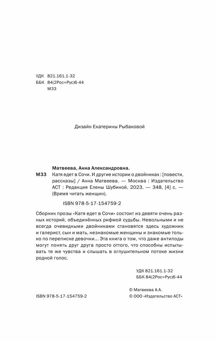 Катя едет в Сочи. И другие истории о двойниках (Матвеева Анна Александровна); АСТ, Редакция Елены Шубиной, 2023