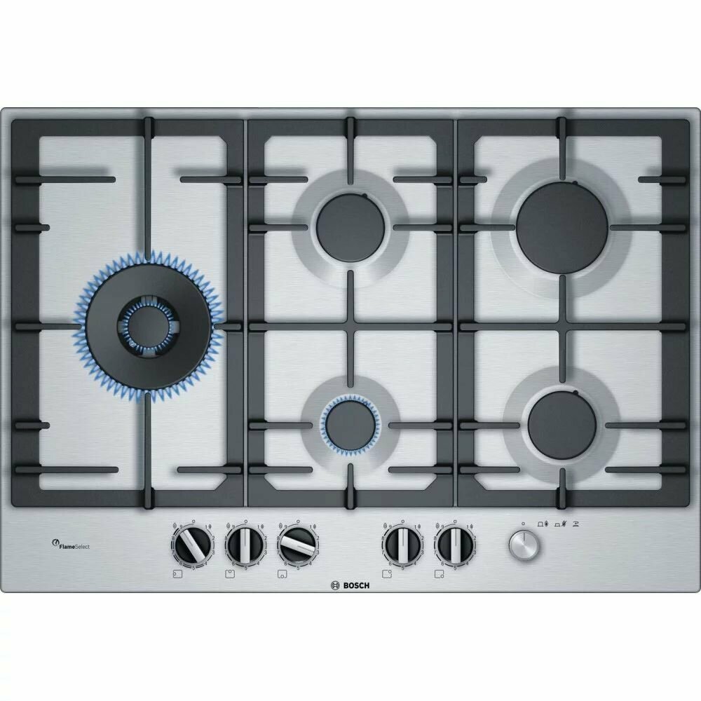 Газовая варочная поверхность Bosch нержавеющая сталь, независимая установка, материал поверхности нержавеющая сталь, количество конфорок: 5шт.