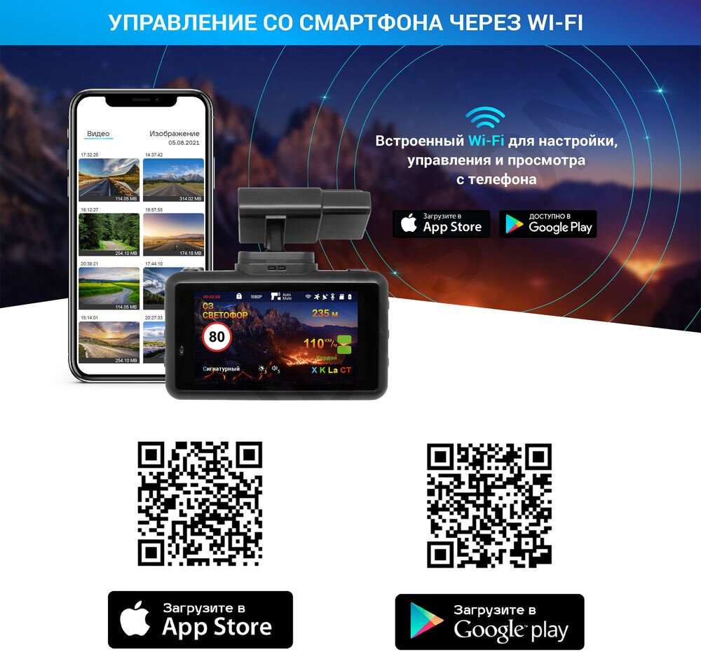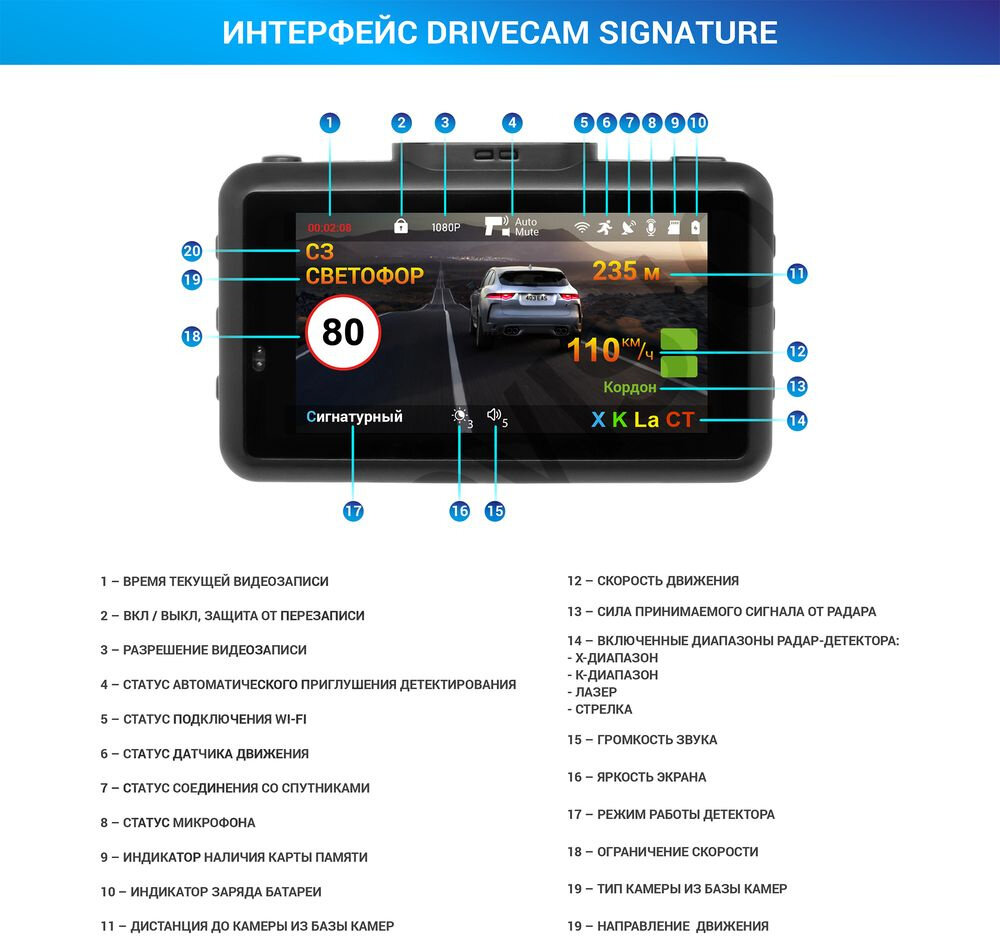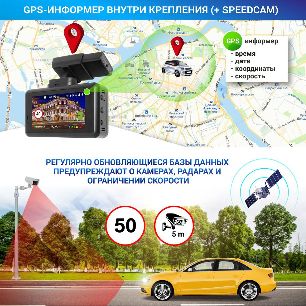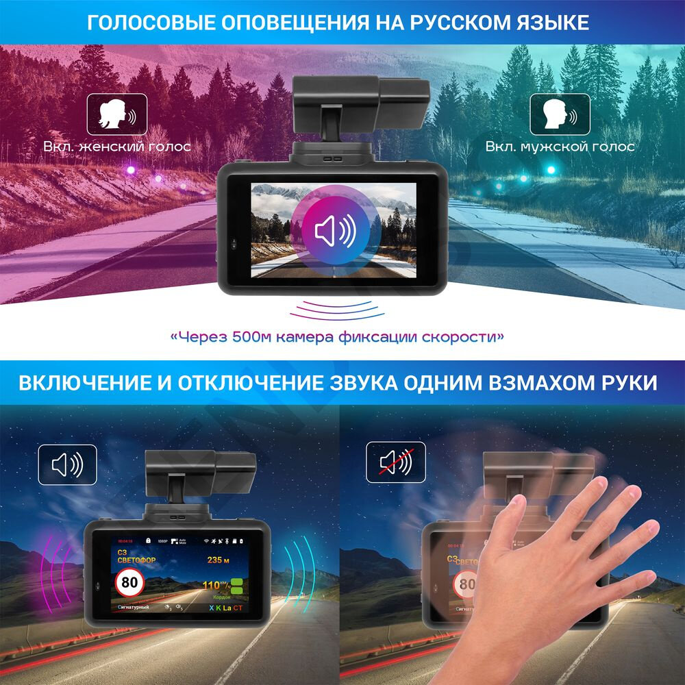 | Особенности | крепление с активной зарядкой, сигнатурный радар-детектор, управление жестами |