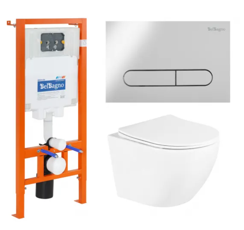 Комплект 3 в 1 BelBagno Унитаз Uno BB3105CHR/SC+Система инсталляции BB002-80+Кнопка BB005-PR-CH BB3105CHR/SC/BB002-80/BB005-PR-CHROME