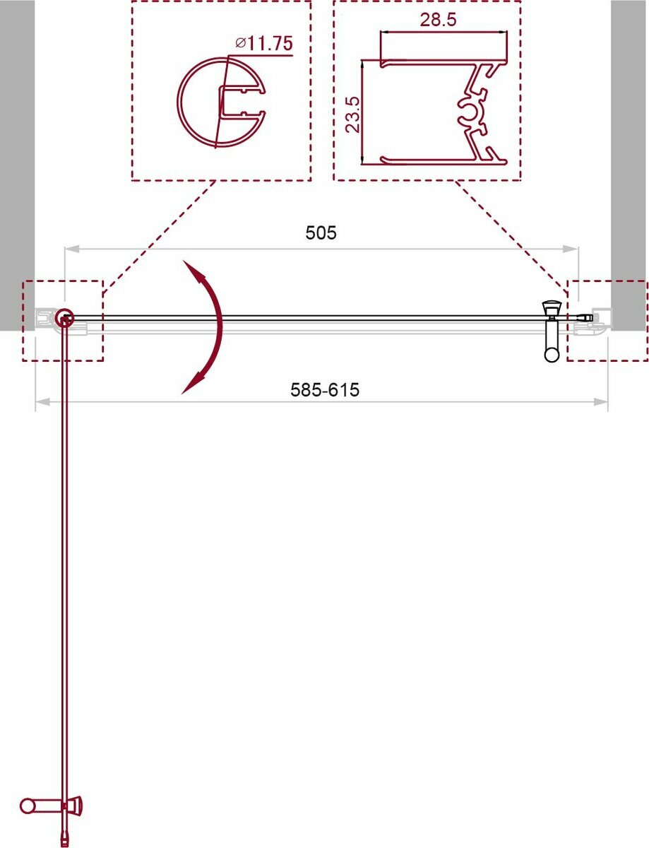- Регулировка ширины предусмотрена за счет боковых профилей, что позволяет без проблем установить изделие даже при кривизне стен.