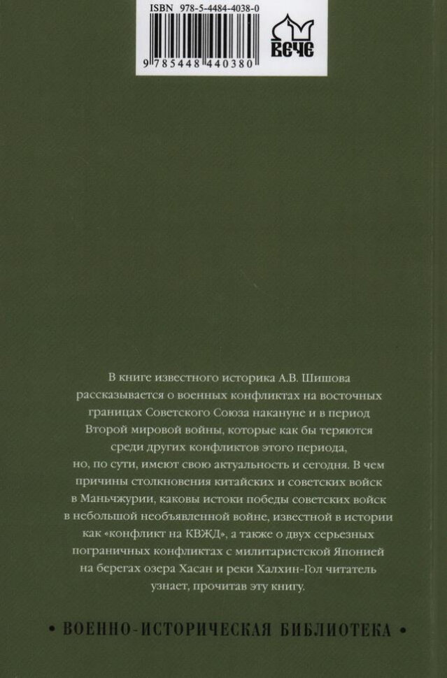 В книге известного историка А.В. Шишова рассказывается о военных конфликтах на восточных границах Советского Союза накануне и в период Второй мировой войны, которые как бы теряются среди других конфликтов этого периода, но, по сути, имеют свою актуальность и сегодня. В чем причины столкновения китайских и советских войск в Маньчжурии, каковы истоки победы советских войск в небольшой необъявленной войне, известной в истории как "конфликт на КВЖД", а также о двух серьезных пограничных конфликтах с милитаристской Японией на берегах озера Хасан и реки Халхин-Гол читатель узнает, прочитав эту книгу.