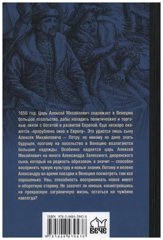 1656 год. Царь Алексей Михайлович снаряжает в Венецию большое посольство, дабы наладить политические и торговые связи с богатой и развитой Европой. Еще нескоро окажется "прорублено окно в Европу". Это удастся лишь сыну Алексея Михайловича - Петру, но никому не дано знать будущее, поэтому на посольство в Венецию возлагаются большие надежды. Особенно надеется царь Алексей Михайлович на юного Александра Залесского, дворянского сына, который на редкость образован, а значит - способен воспринять чужую культуру и новые знания. Потому и велено Александру во время поездки в Венецию посмотреть там все хорошенько. Увы, способность воспринимать новое имеет и оборотную сторону. Не захочет ли юноша, насмотревшись на прекрасную заграничную жизнь, остаться на чужбине навсегда?