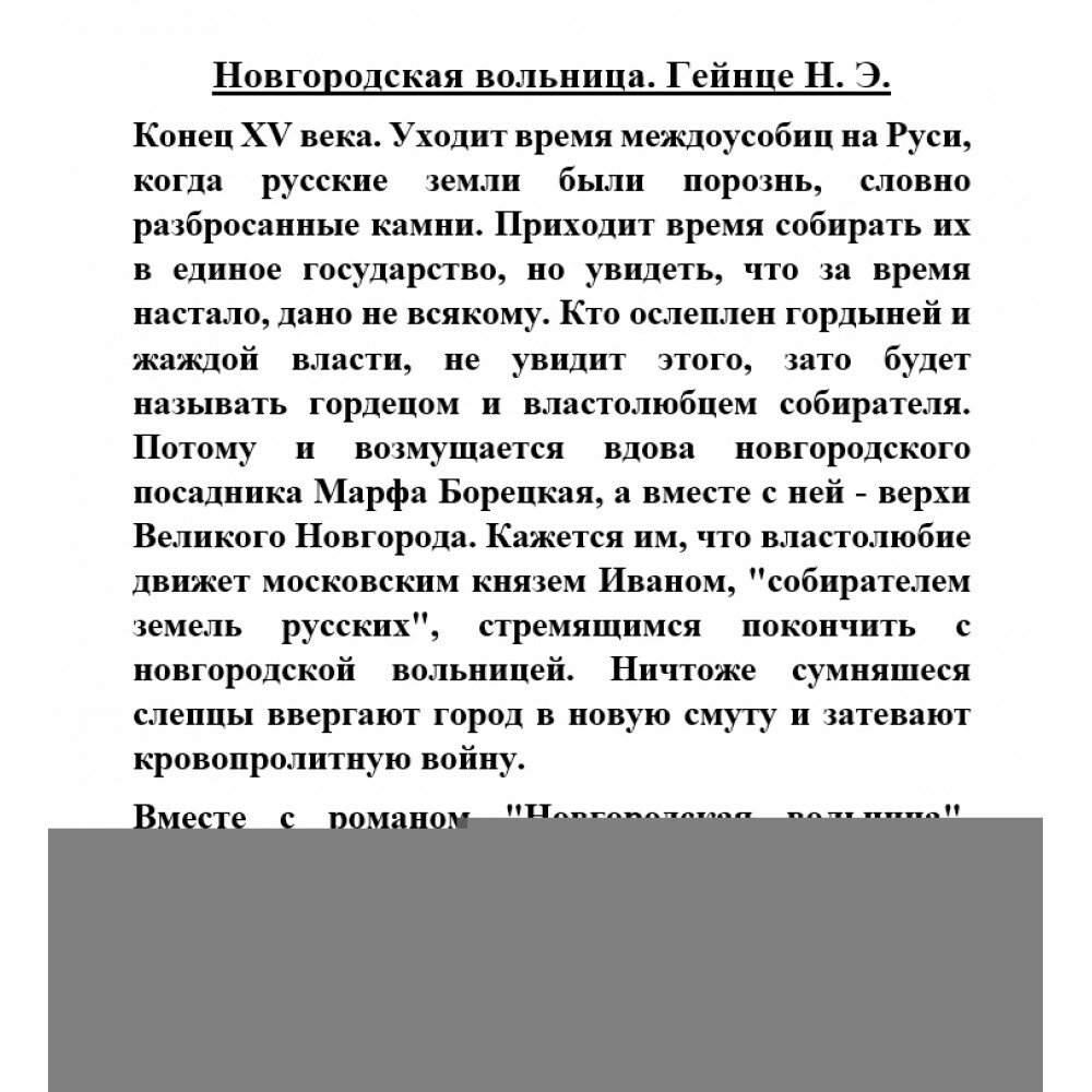 Роман известного русского писателя Николая Эдуардовича Гейнце (1852-1913) «Новгородская вольница» является, на мой взгляд, одним из замечательных произведений, рассказывающих нам об объединении русских земель вокруг Москвы и превращении её в единый центр Русского средневекового государства.