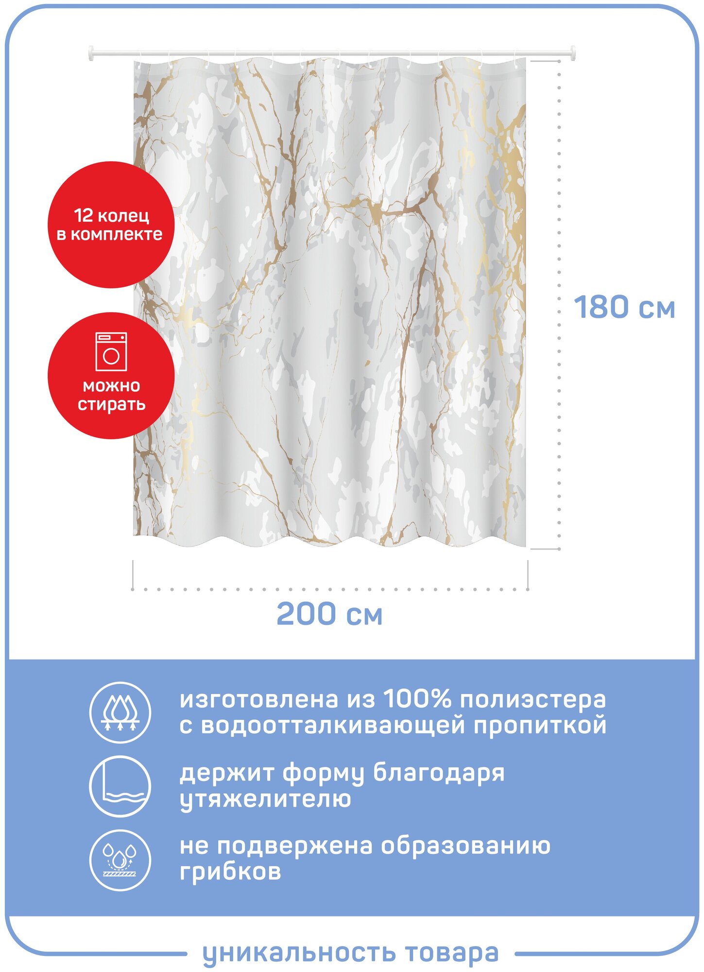 Штора для ванной Марбл материал полиэстер 200х180 см Hoff (размер: 200x180 см)