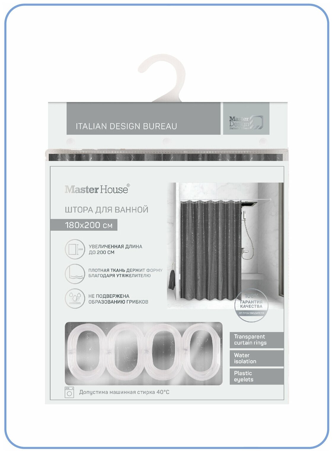 Вы ищите штору для ванны? Вот же она – штора для душа с кольцами от Master House! Стильный рисунок шторы для ванной внесёт в ваше помещение не просто практический акцент, но и сделает его нарядным. Штора для ванной 200х180см изготовлена из современного материала, лёгкого и эластичного – не заминающегося и не прилипающего. Он, как и краска рисунка, совершенно нетоксичны даже во влажной среде, какая всегда бывает в ванной. Капли стекают с водоотталкивающей поверхности, потому штора для ванной всегда остаётся сухой, и не покрывается плесенью. Кольца и люверсы из прозрачного полипропилена никогда не проржавеют. Так что штора для душа с кольцами будет вам долго служить, радуя глаз и заряжая настроением от утреннего до вечернего душа.