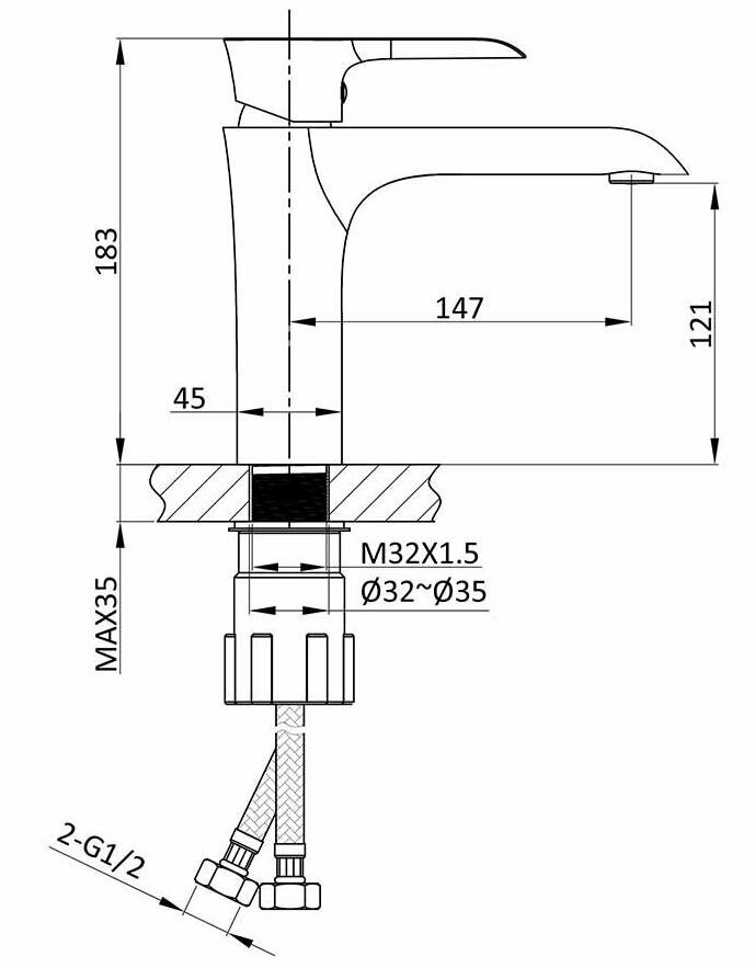 Смеситель для раковины. Цвет: хром. Излив: фиксированный. Материал: латунь, 35мм картдриж, 2 шланга подачи воды в комплекте.